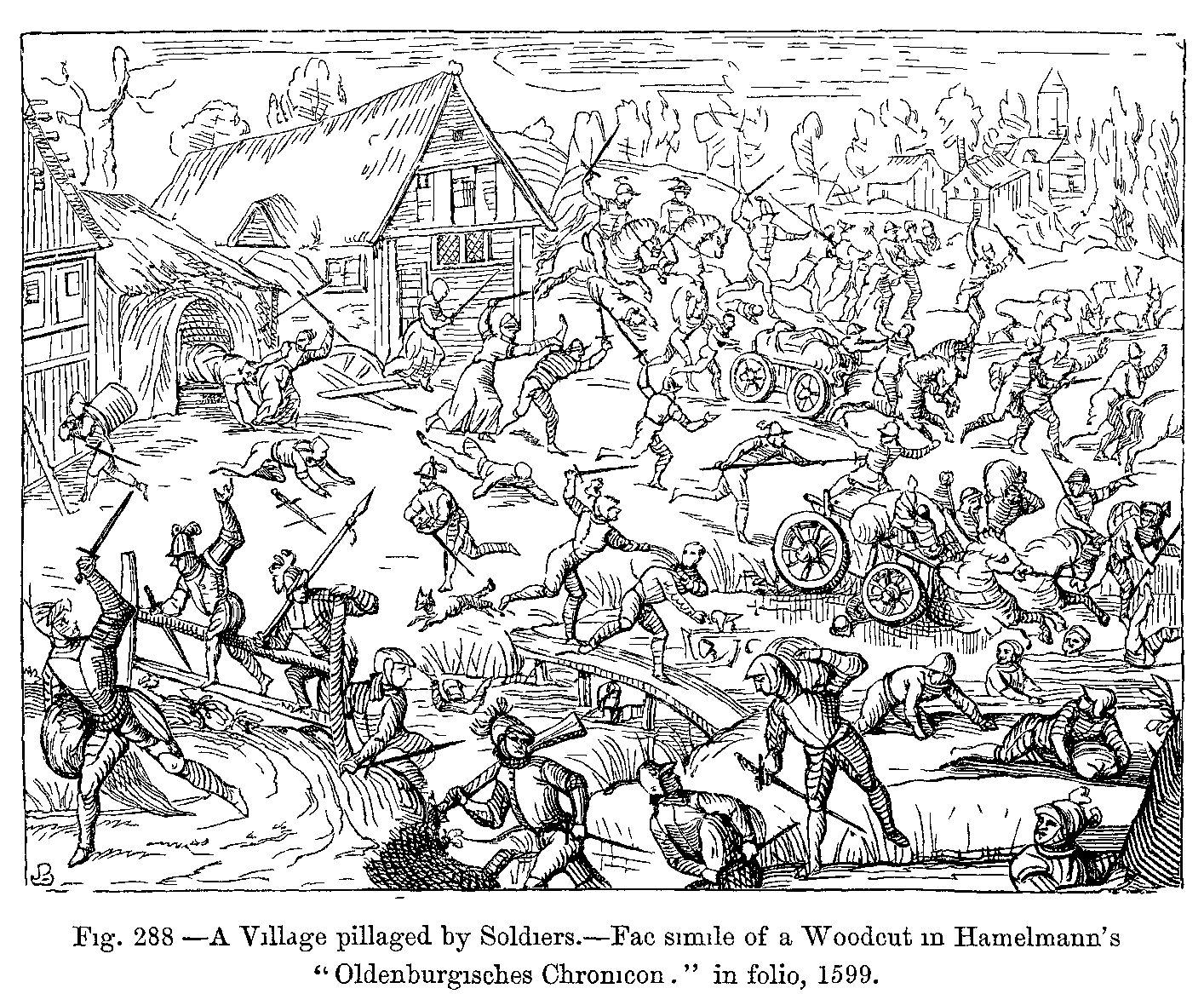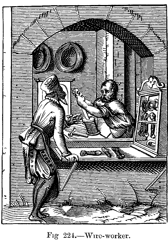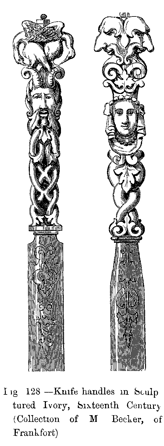 During the sixteenth century, ladies wore the skirts of their dresses, which were tight at the waist and open in front, very wide, displaying the lower part of a very rich under petticoat, which reached to the ground, completely concealing the feet. This, like the sleeves with puffs, which fell in circles to the wrists, was altogether an Italian fashion. Frequently the hair was turned over in rolls, and adorned with precious stones, and was surmounted by a small cap, coquettishly placed either on one side or on the top of the head, and ornamented with gold chains, jewels, and feathers. The body of the dress was always long, and pointed in front. Men wore their coats cut somewhat after the same shape: their trunk hose were tight, but round the waist they were puffed out. They wore a cloak, which only reached as far as the hips, and was always much ornamented; they carried a smooth or ribbed cap on one side of the head, and a small upright collar adorned the coat. This collar was replaced, after the first half of the sixteenth century, by the high, starched ruff, which was kept out by wires; ladies wore it still larger, when it had somewhat the appearance of an open fan at the back of the neck.