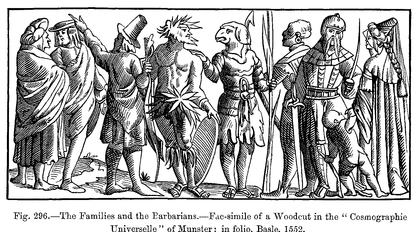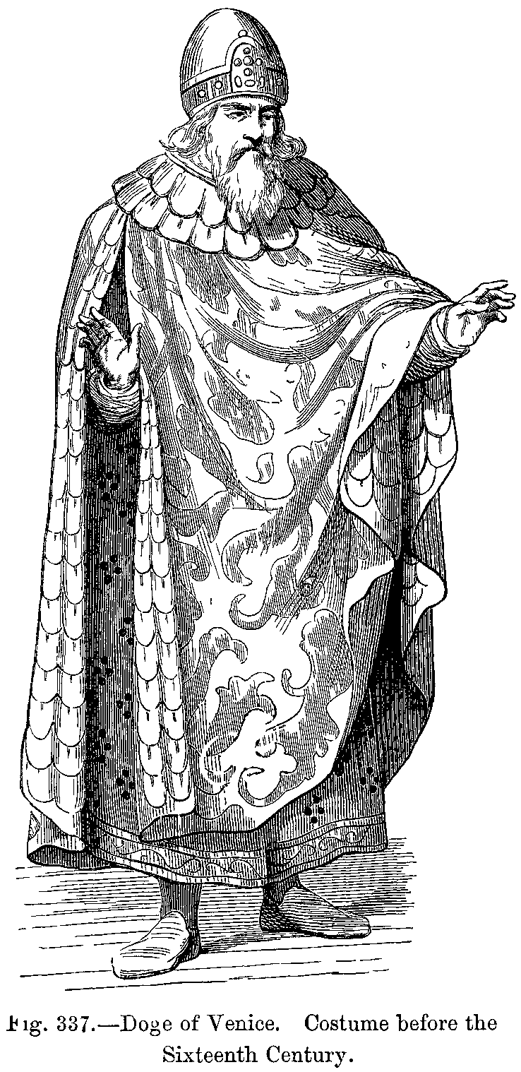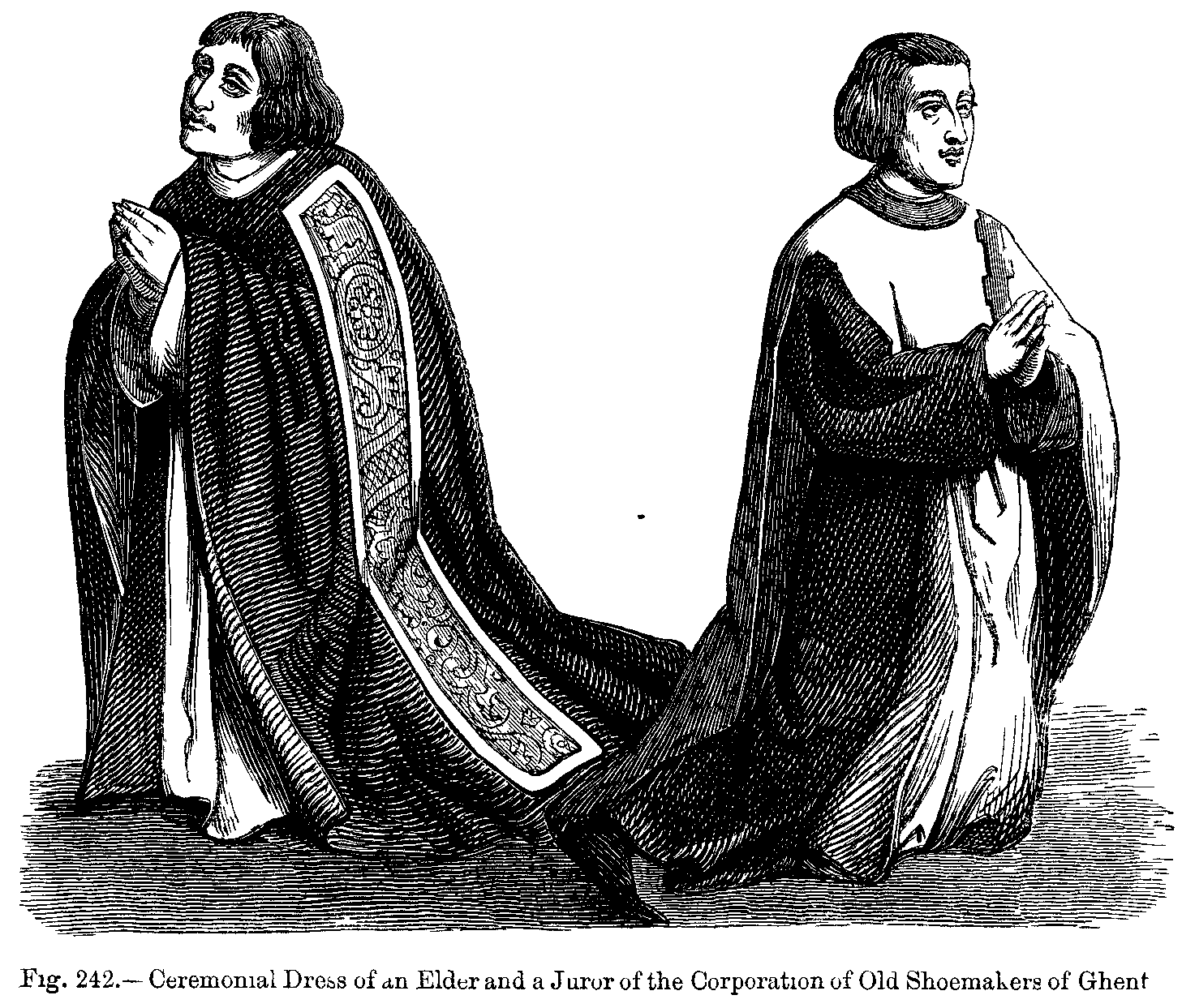 "There were two kinds of mantles; one was open in front, and fell over the back, and a strap which crossed the chest held it fixed on the shoulders; the other, enveloping the body like a bell, was slit up on the right side, and was thrown back over the left arm; it was made with a fur collar, cut in the shape of a tippet. This last has been handed down to us, and is worn by our judges under the name of toge and épitoge.