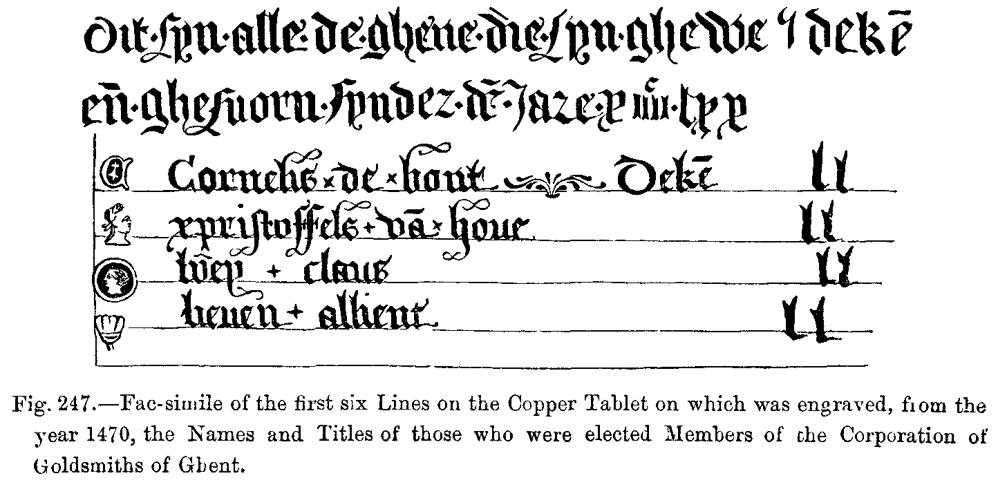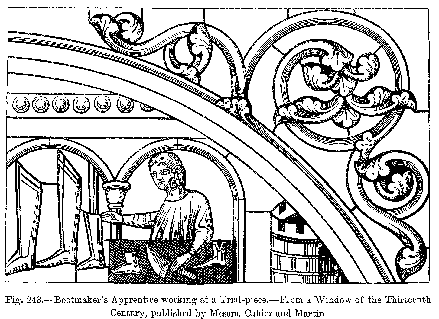 "The shoes were made of various kinds of leather, the quality of which depended on the way in which they were tanned, and were either of common leather, or of leather which was similar to that we know as morocco, and was called cordouan or cordua (hence the derivation of the word cordouannier, which has now become cordonnier). Shoes were generally made pointed; this fashion of the poulaines, or Polish points, was followed throughout the whole of Europe for nearly three hundred years, and, when first introduced, the Church was so scandalized by it that it was almost placed in the catalogue of heresies. Subsequently, the taste respecting the exaggerated length of the points was somewhat modified, but it had become so inveterate that the tendency for pointed shoes returning to their former absurd extremes was constantly showing itself. The pointed shoes became gradually longer during the struggles which were carried on in the reign of Philippe le Bel between Church and State.