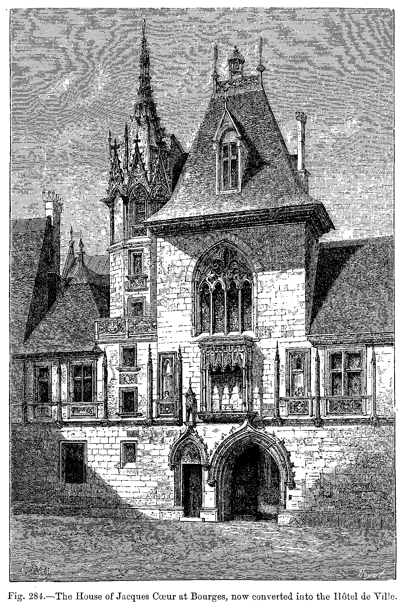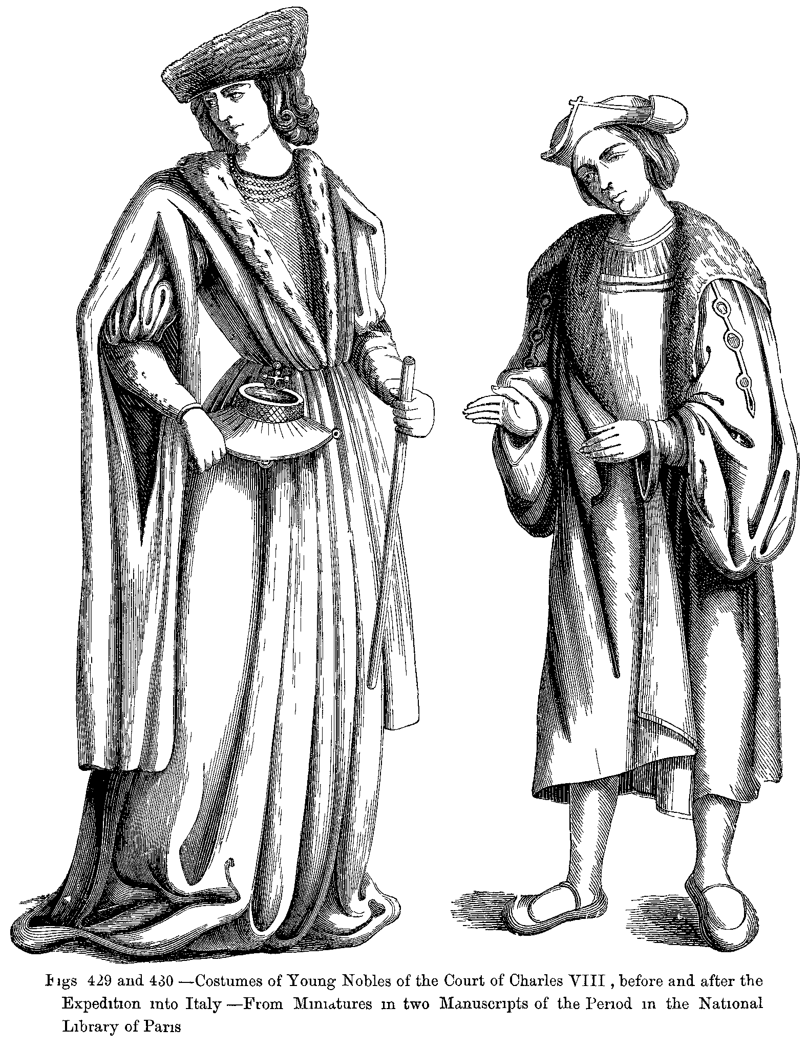 Under Charles VIII. the mantle, trimmed with fur, was open in front, its false sleeves being slit up above in order to allow the arms of the under coat to pass through. The cap was turned up; the breeches or long hose were made tight-fitting. The shoes with poulaines were superseded by a kind of large padded shoe of black leather, round or square at the toes, and gored over the foot with coloured material, a fashion imported from Italy, and which was as much exaggerated in France as the poulaine had formerly been. The women continued to wear conical caps (hennins) of great height, covered with immense veils; their gowns were made with tight-fitting bodies, which thus displayed the outlines of the figure (Figs. 427 and 428).