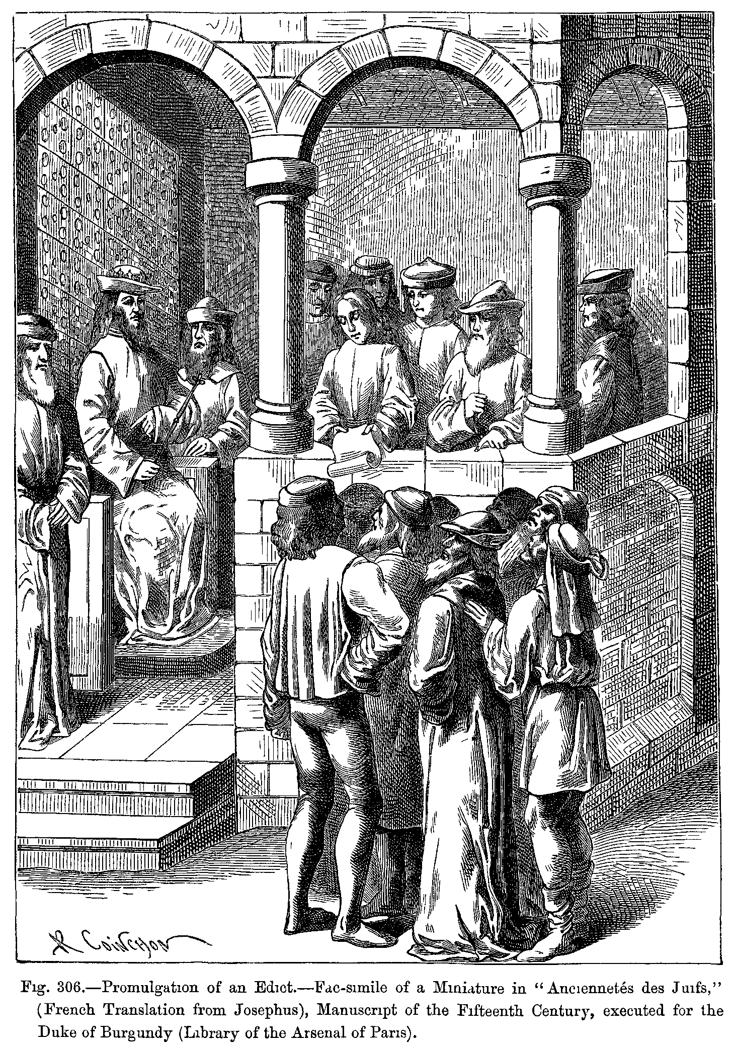 Dispersion of the Jews.--Jewish Quarters in the Mediæval Towns.--The Ghetto of Rome.--Ancient Prague.--The Giudecca of Venice.--Condition of the Jews; Animosity of the People against them; Vexations Treatment and Severity of the Sovereigns.--The Jews of Lincoln.--The Jews of Blois.--Mission of the Pastoureaux.--Extermination of the Jews.--The Price at which the Jews purchased Indulgences.--Marks set upon them.--Wealth, Knowledge, Industry, and Financial Aptitude of the Jews.--Regulations respecting Usury as practised by the Jews.--Attachment of the Jews to their Religion.