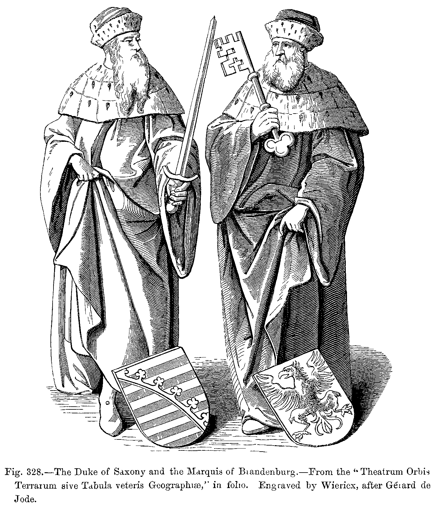 If we take a retrospective glance at the numerous changes of costume which we have endeavoured to describe in this hurried sketch, we shall find that amongst European nations, during the Middle Ages, there was but one common standard of fashion, which varied from time to time according to the particular custom of each country, and according to the peculiarities of each race. In Italy, for instance, dress always maintained a certain character of grandeur, ever recalling the fact that the influence of antiquity was not quite lost. In Germany and Switzerland, garments had generally a heavy and massive appearance; in Holland, still more so (Figs. 436 and 437). England uniformly studied a kind of instinctive elegance and propriety. It is a curious fact that Spain invariably partook of the heaviness peculiar to Germany, either because the Gothic element still prevailed there, or that the Walloon fashions had a special attraction to her owing to associations and general usage. France was then, as it is now, fickle and capricious, fantastical and wavering, but not from indifference, but because she was always ready to borrow from every quarter anything which pleased her. She, however, never failed to put her own stamp on whatever she adopted, thus making any fashion essentially French, even though she had only just borrowed it from Spain, England, Germany, or Italy. In all these countries we have seen, and still see, entire provinces adhering to some ancient costume, causing them to differ altogether in character from the rest of the nation. This is simply owing to the fact that the fashions have become obsolete in the neighbouring places, for every local costume faithfully and rigorously preserved by any community at a distance from the centre of political action or government, must have been originally brought there by the nobles of the country. Thus the head-dress of Anne of Brittany is still that of the peasant-women of Penhoét and of Labrevack, and the hennin of Isabel of Bavaria is still the head-dress of Normandy.