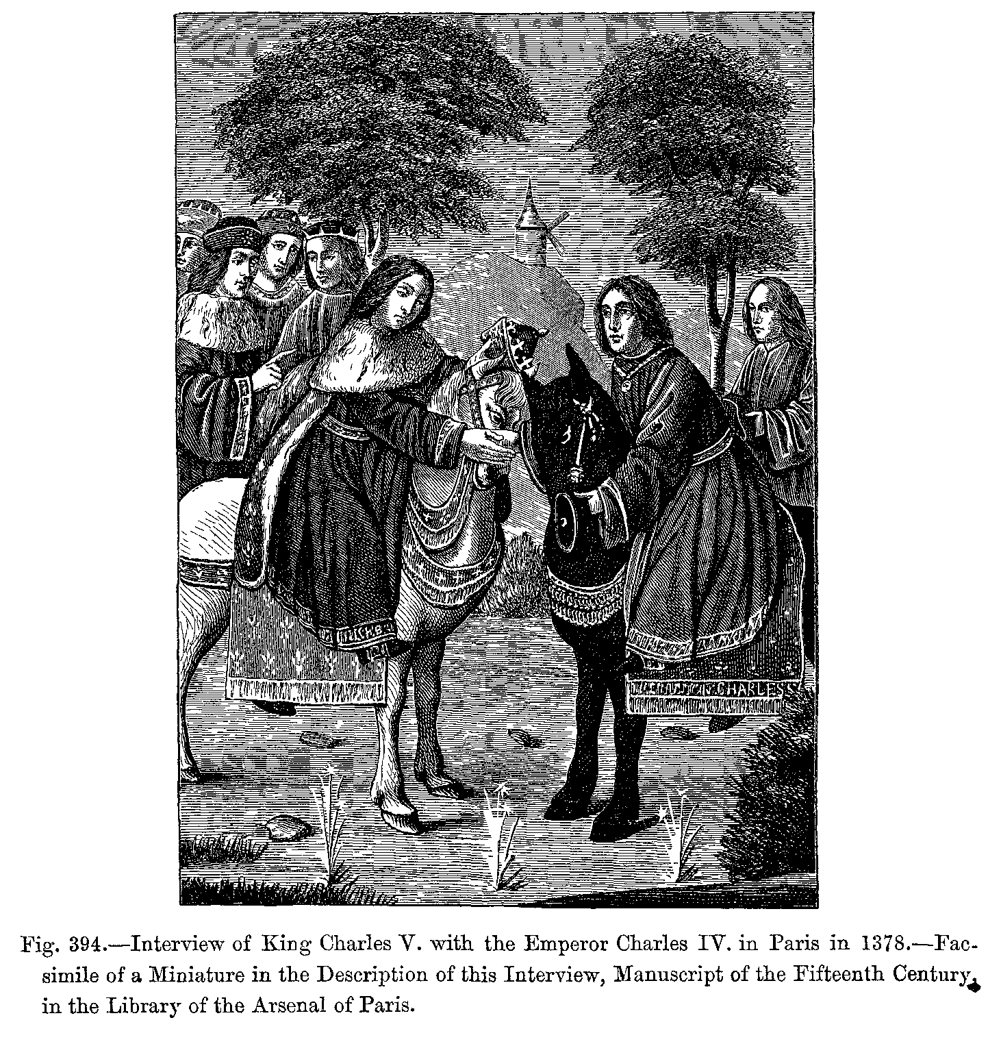 And this is not the only testimony to the ridiculous and extravagant tastes of this unfortunate period. One writer speaks with indignation of the goats' beards (with two points), which seemed to put the last finishing touch of ridicule on the already grotesque appearance of even the most serious people of that period. Another exclaims against the extravagant luxury of jewels, of gold and silver, and against the wearing of feathers, which latter then appeared for the first time as accessories to both male and female attire. Some censure, and not without reason, the absurd fashion of converting the ancient leather girdle, meant to support the waist, into a kind of heavy padded band, studded with gilded ornaments and precious stones, and apparently invented expressly to encumber the person wearing it. Other contemporary writers, and amongst these Pope Urban V. and King Charles V. (Fig. 422), inveigh against the poulaines, which had more than ever come into favour, and which were only considered correct in fashion when they were made as a kind of appendix to the foot, measuring at least double its length, and ornamented in the most fantastical manner. The Pope anathematized this deformity as "a mockery of God and the holy Church," and the King forbad craftsmen to make them, and his subjects to wear them. All this is as nothing in comparison with the profuse extravagance displayed in furs, which was most outrageous and ruinous, and of which we could not form an idea were it not for the items in certain royal documents, from which we gather that, in order to trim two complete suits for King John, no fewer than six hundred and seventy martens' skins were used. It is also stated that the Duke of Berry, the youngest son of that monarch, purchased nearly ten thousand of these same skins from a distant country in the north, in order to trim only five mantles and as many surcoats. We read also that a robe made for the Duke of Orleans, grandson of the same king, required two thousand seven hundred and ninety ermines' skins. It is unnecessary to state, that in consequence of this large consumption, skins could only be purchased at the most extravagant prices; for example, fifty skins cost about one hundred francs (or about six thousand of present currency), showing to what an enormous expense those persons were put who desired to keep pace with the luxury of the times (Fig. 424).