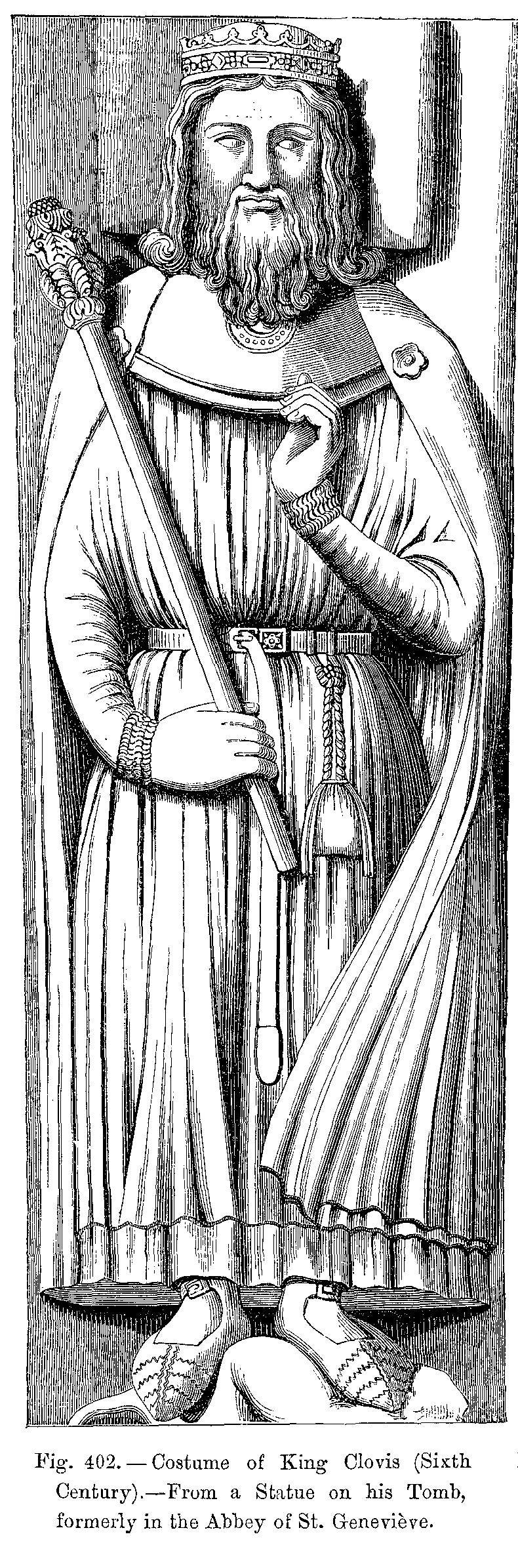 We shall commence our historical sketch from the fifth century, at which period we can trace the blending of the Roman with the barbaric costume--namely, the combination of the long, shapeless garment with that which was worn by the Germans, and which was accompanied by tight-fitting braies. Thus, in the recumbent statue which adorned the tomb of Clovis, in the Church of the Abbey of St. Geneviève, the King is represented as wearing the tunic and the toga, but, in addition, Gallo-Roman civilization had actually given him tight-fitting braies, somewhat similar to what we now call pantaloons. Besides this, his tunic is fastened by a belt; which, however, was not a novelty in his time, for the women then wore long dresses, fastened at the waist by a girdle. There is nothing very remarkable about his shoes, since we find that the shoe, or closed sandal, was worn from the remotest periods by nearly all nations (Figs. 402 and 403).