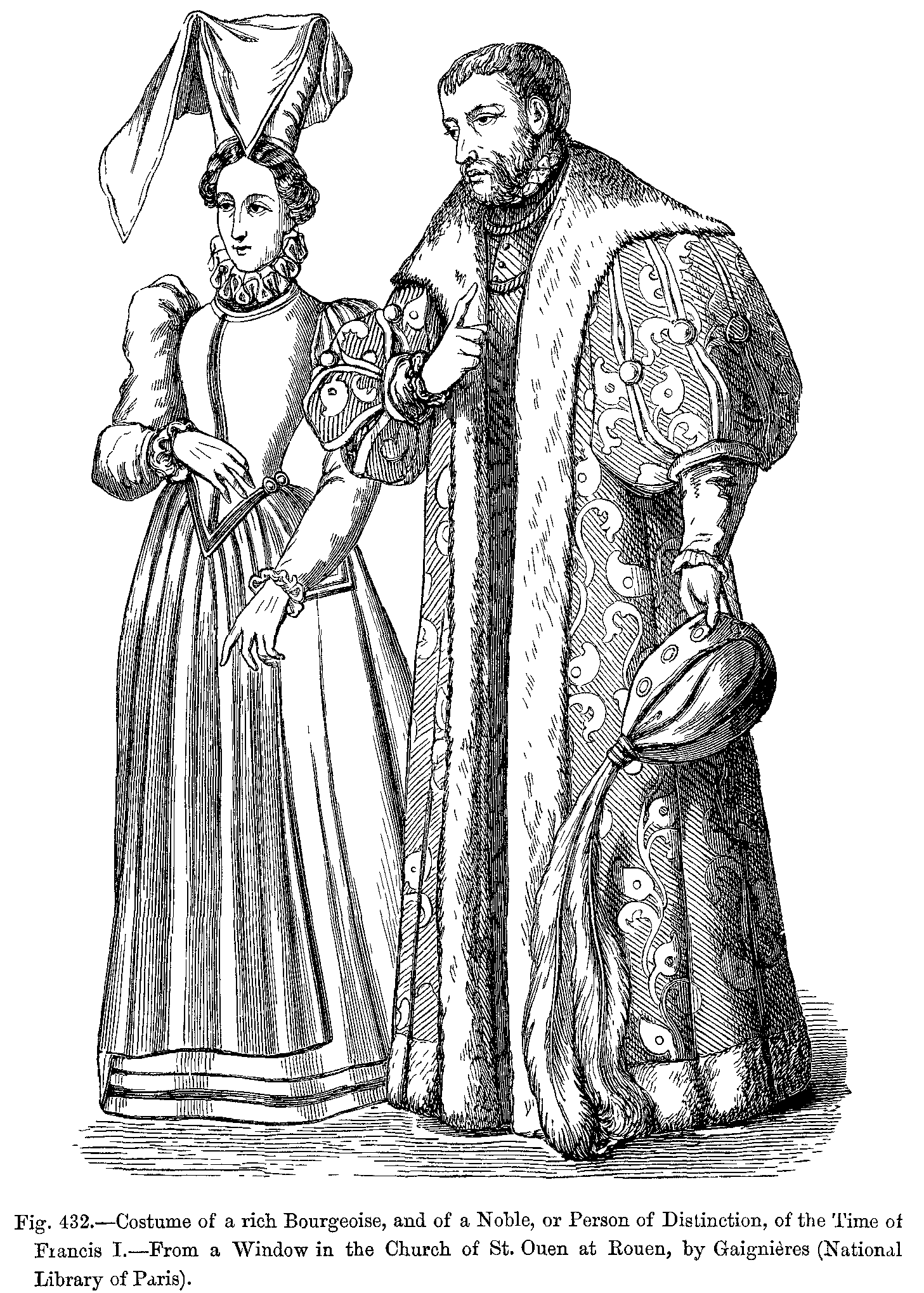 Under Francis I., the costumes adopted from Italy remained almost stationary (Fig. 432). Under Henri II. (Figs. 433 and 434), and especially after the death of that prince, the taste for frivolities made immense progress, and the style of dress in ordinary use seemed day by day to lose the few traces of dignity which it had previously possessed.