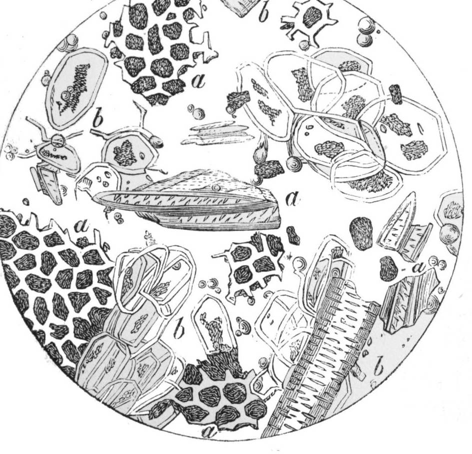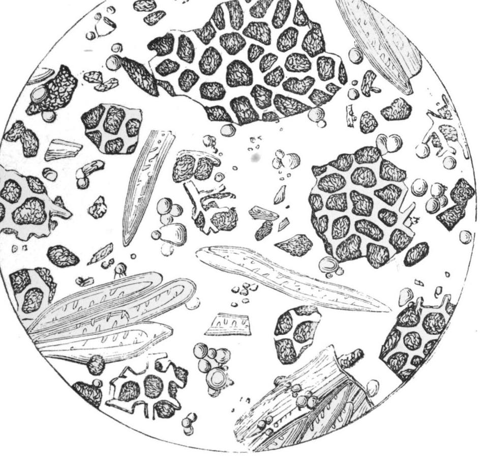 Plate 10 represents the structure and character of genuine ground roasted coffee, and of a fragment of roasted chicory-root, showing the dotted or interrupted spiral vessels which pass in bundles through the central parts of the root, magnified 140 diameters; copied, by permission, from Dr. Hassall’s work on “Food and its Adulterations.”