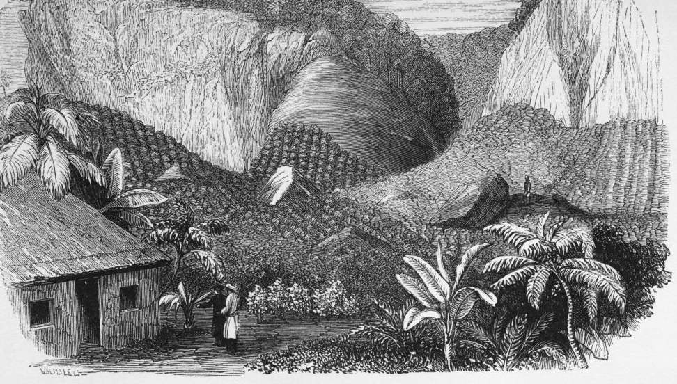Nothing can exceed the beauty of the rows or walks planted with coffee-trees, from their pyramidical shape and glossy dark leaves, amongst which are hanging the ripe, scarlet-coloured berries. A writer, in his “Impressions of the West Indies,” thus speaks: “Anything in the way of cultivation more beautiful or more fragrant than a coffee-plantation I had not conceived, and oft did I say to myself that if ever I became, from health or otherwise, a cultivator of the soil within the tropics, I would cultivate the coffee-plant, even though I did so irrespective altogether of the profit that might be derived from so doing. Much has been written, and not without justice, of the rich fragrance of an orange-grove, and at home we ofttimes hear of the sweet odours of a bean-field. I have, too, often enjoyed, in the Carse of Stirling and elsewhere in Scotland, the balmy breezes as they swept over the latter, particularly when the sun had burst out with unusual strength after a shower of rain. I have likewise in Martinique, Santa Cruz, Jamaica, and Cuba, inhaled the breezes wafted from the orangeries, but not for a moment would I compare either with the exquisite aromatic odours from a coffee-plantation in full bloom, when the hill-side—covered over with regular rows of the shrubs, with their millions of jasmine-like flowers—showers down upon you as you ride up between the plants a perfume