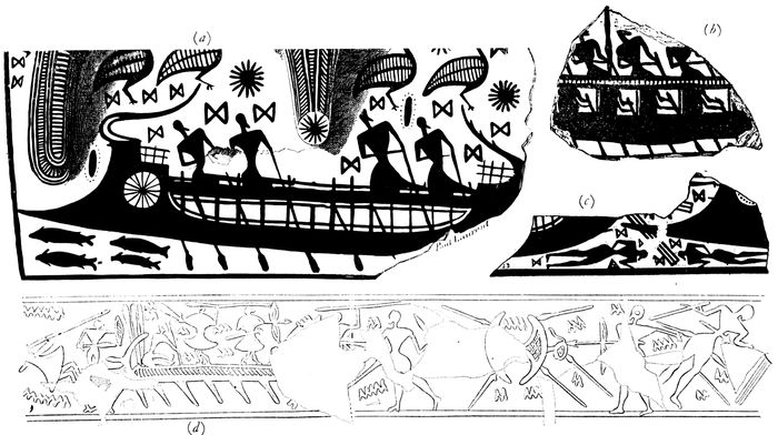 1600. Brueckner and Pernice, Ath. Mitt. XVIII. p. 153, followed by e.g. Helbig, Mém. Acad. Inscr. et B.-L. XXXVI. (1898), pp. 387 f. Against this view see Assmann, Berl. Phil. Woch. 1899, pp. 16 f., who argues merely (1) that the dead on the ships proves them Phoenician, (2) that if the Athenians depicted their own ships, there would be more ships on Black and Red Figure Attic vases. But against this note (1) that the Dipylon vases are funeral vases, (2) that, in spite of Salamis, fifth century Attic vases do not abound with pictures of enemy ships.