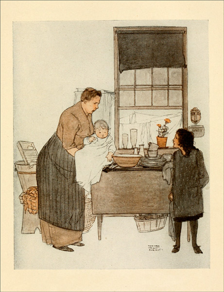 And, George, do you know about Janet? Dave McFadden has never once fell off the water wagon! What do you know about that? Mrs. McFadden got home from the hospital just after you left. She's real weak and she'll probably never be able to work again. She just sits around and complains and what do you think? Dave waits on her like she was a baby and don't say a word. Miss Harris from the Settlement House explained about it to Janet and me. She said that time that Dave was laid up with a broken leg and Mrs. McFadden began working out and Dave saw how easy it was for him to get along without supporting Mrs. McFadden and Janet that he lost the sense of family responsibility. And Miss Harris says it just took a thing like this to wake him up. And Miss Harris says it was Mrs. McFadden's big mistake to take Dave's[352] place ever because lots of men are just that way when they see their wives and mothers can earn money by working out they just let them and Miss Harris says a woman has enough to do at home and taking care of her children. I'm sure my mother has, don't you think so, George?