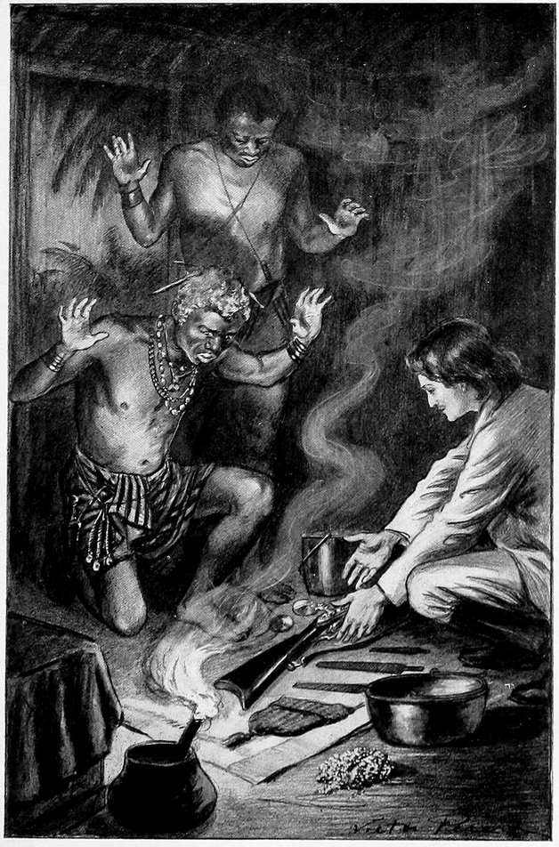 225The following evening, when it was quite dark, Regundo, Oshoria, Ogoola, Ngola, and Quabi came into my hut, as I had told them to do. All the people were asleep and no one had seen them come in. I gave them powder and presents for them and their wives. They implored me to tell to no one that I had given them presents, saying people might become jealous and bewitch them.
