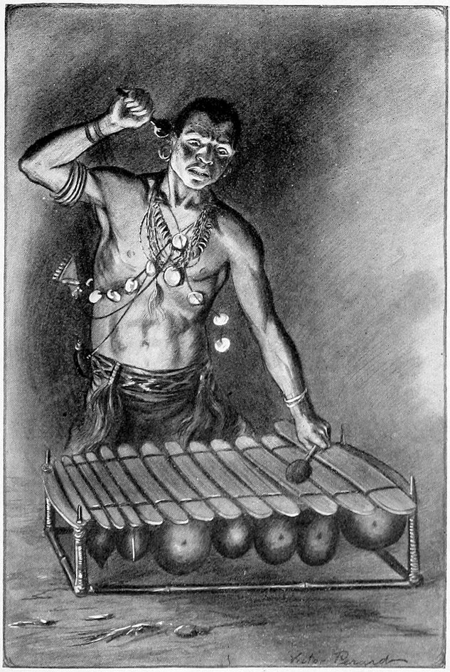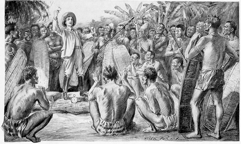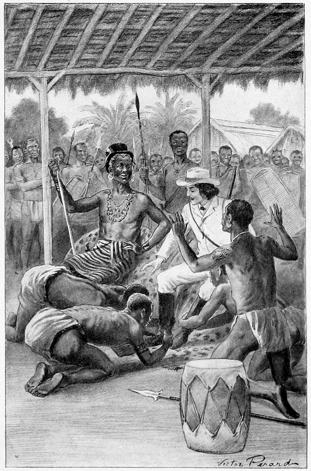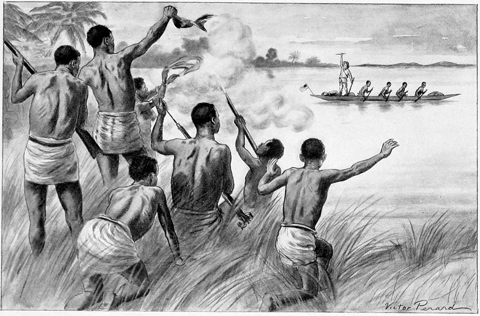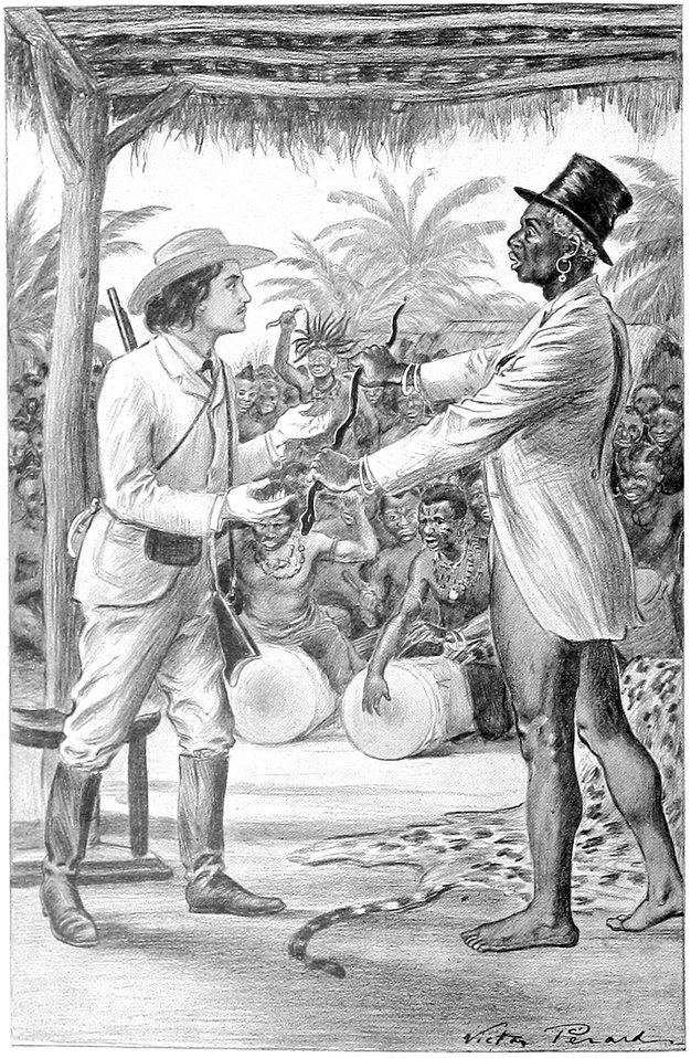 King Mombo was on the shore to receive me, beating his kendo and calling on the spirits of his ancestors to come and see the sight. Mombo wore a waistcoat and a coat, but had no shirt or trousers. We embraced each other amid the shouts of his people, who had also come to welcome me back. Many tomtoms were beating violently in the village, and guns were fired to celebrate my return. The people were wild with excitement.