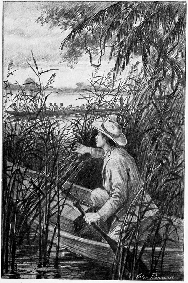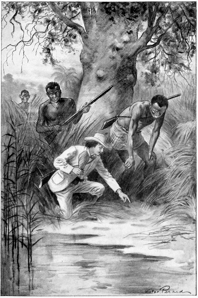Quabi and Ngola went to reconnoitre during the day, and came back with the news that further down the prairie there was a little lake, the shores of which were entirely covered with elephants’ tracks, and that the forest near there showed that elephants had been in that region during the night.
