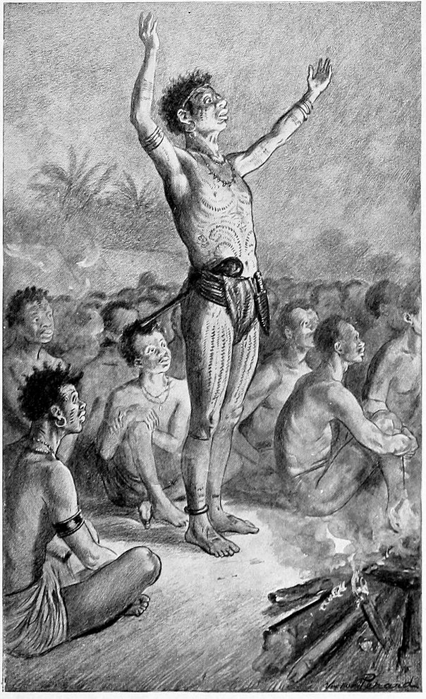 224After these words he paused, then he called upon the spirits of his ancestors to witness the promise he had just made to me. He called first on the spirit of Olenda, then on that of Ratenoo, then upon the spirit of Ronpano twice, of Sholomba three times, of Adooma four times. These had been great men and had accomplished valiant deeds in their day, which had been repeated to the people generation after generation. The spirits upon which he called several times had died long ago, and Adooma, upon whom he had called four times, was the father of the clan and had died long, long ago. In the great forest each tribe is divided into a number of clans, each clan having its chief.