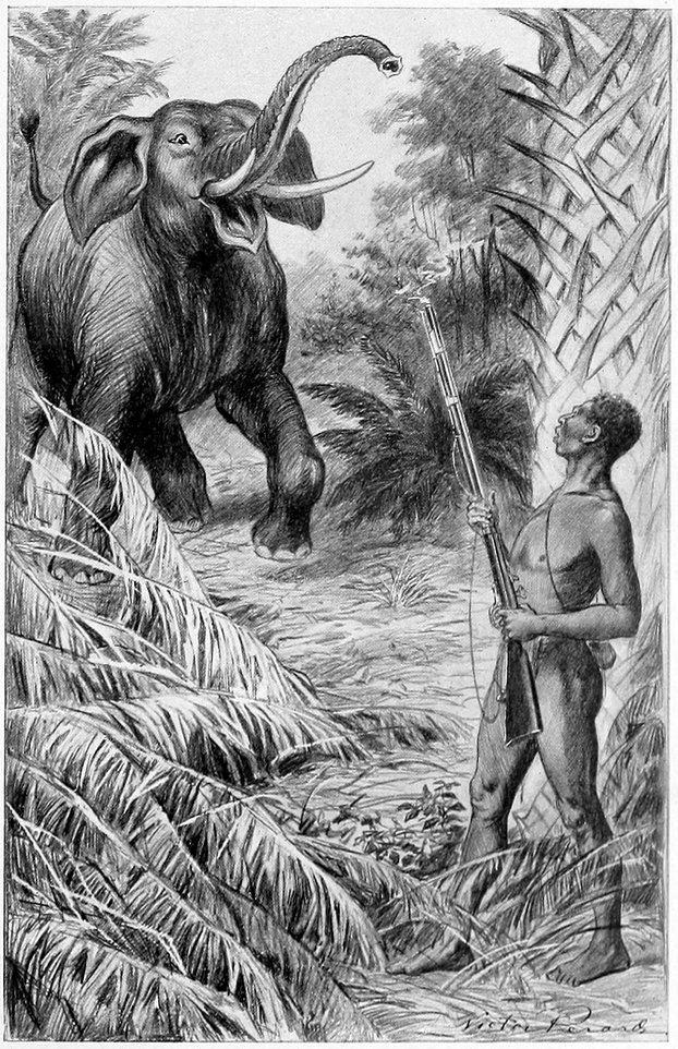 In the twinkling of an eye I took three steps backward, and was protected by the burned trunk of a tree. I was just in time. The infuriated animal passed close by me. As he did so, I fired behind his right shoulder, but he did not fall, and went on into the forest followed by the cow elephants. I was sure “Bulldog” had hit the huge beast, and Oshoria was much surprised that the elephant had not fallen dead. He eyed “Bulldog,” as if to say: “I do not understand why you did not kill the elephant outright.”