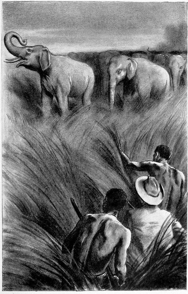 The three hunters started. They bent over so low that their heads and shoulders only appeared above the grass; they were going directly towards the lone elephant. At times they would lie flat on the ground and disappear entirely from sight, then reappear again. The wind was in their favor, for it blew from the elephant towards them, so the huge beast could not scent danger. Fortunately also, they and he were going in the same direction, towards the lake. I whispered to Oshoria: “I am glad that the 209men will be in such a position that when they shoot the elephant, he will not be able to see them and charge.”
