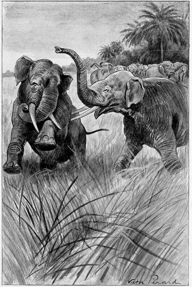 “Once more the two bulls looked at each other. The wounded elephant did not want to give up the fight before another trial of strength. He felt that this was his last chance. They came towards each other at a furious rate. The two heads met with tremendous force, and a sound like the sudden rolling of thunder far away in the forest. A man caught between those two heads would have been mashed as flat as the hide of an antelope. The solitary bull was stunned by the blow. He staggered an instant, and it was all over with him. He had not the strength to flee for his life, and at that moment the other charged him on the flank. The two enormous tusks went through his side, and he fell dead. The tusks had penetrated nearly three feet into the body. The victor returned to his herd, which received him with loud trumpetings of joy.