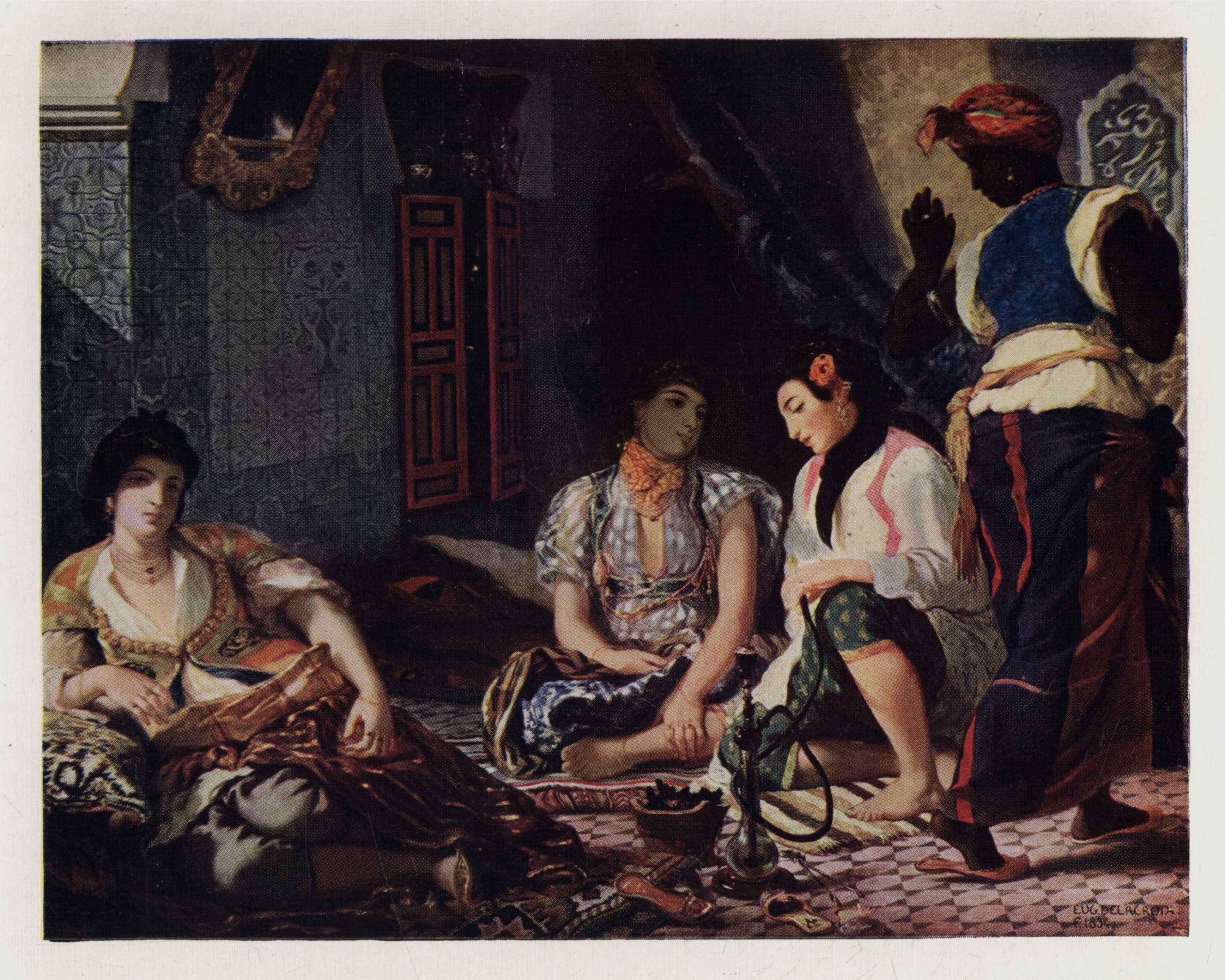 This picture was one of the first-fruits of Delacroix's journey to Morocco with Count Mornay's mission. It was painted in 1833, the year after his return to France, commissioned by the State at the price of 3000 frs. The handling of the upright figure of the negress suggests Spanish influence, and was in turn obviously well known to Manet when he painted his "Olympia."