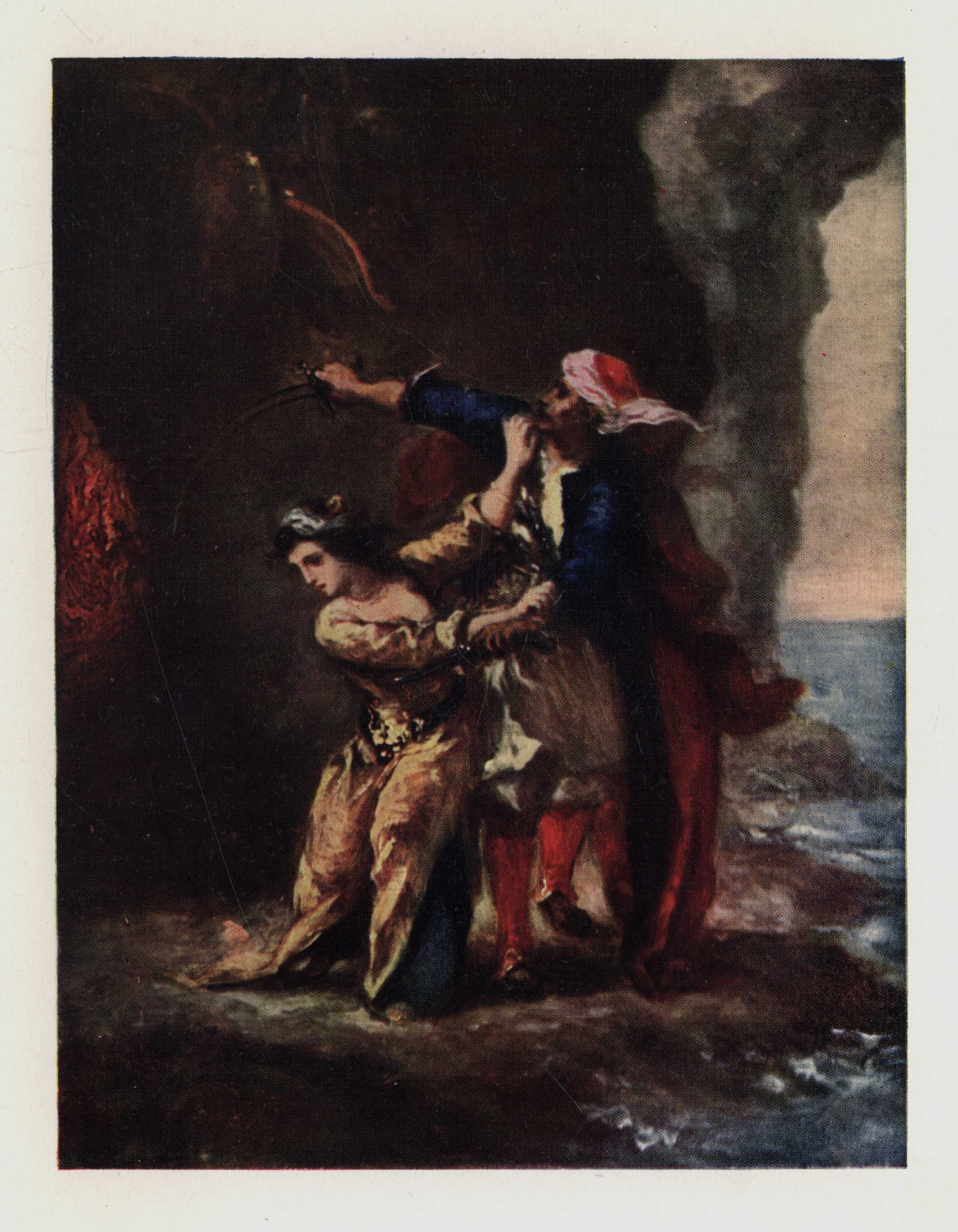 A great reader of English literature, Delacroix found the inspiration for many remarkable paintings in the works of Byron, who was one of the idols of the French Romanticists. As was his wont, Delacroix produced several versions of this subject, which shows Zuleika trying to prevent Selim from giving the signal to his comrades. A smaller variant, painted like the Louvre picture in 1843, and measuring only 14 in. by 10 in., realised the high price of £1282 at public auction in 1874.