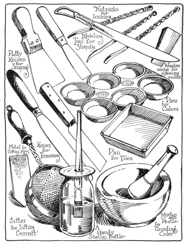 Craftsmen or amateur home-workers who delight in creating and building objects of beauty around them can find in color cement a medium which will appeal to their needs, in that the necessary working equipment is simple and the work can be done within small space.