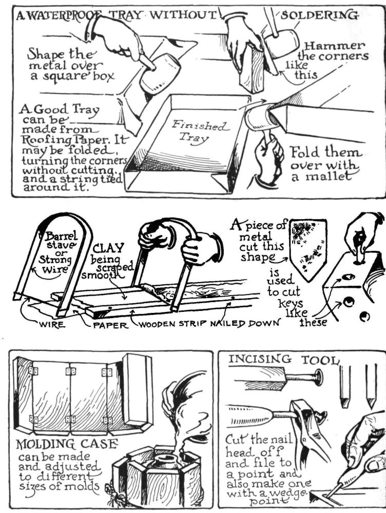To make the trays, lay one of these pieces over a strong box with an even edge and hammer into tray shape as shown in the accompanying plate. The corners should be bent so as to make the trays waterproof without soldering. A wooden mallet should be used for hammering the metal as a metal hammer may cut the metal.