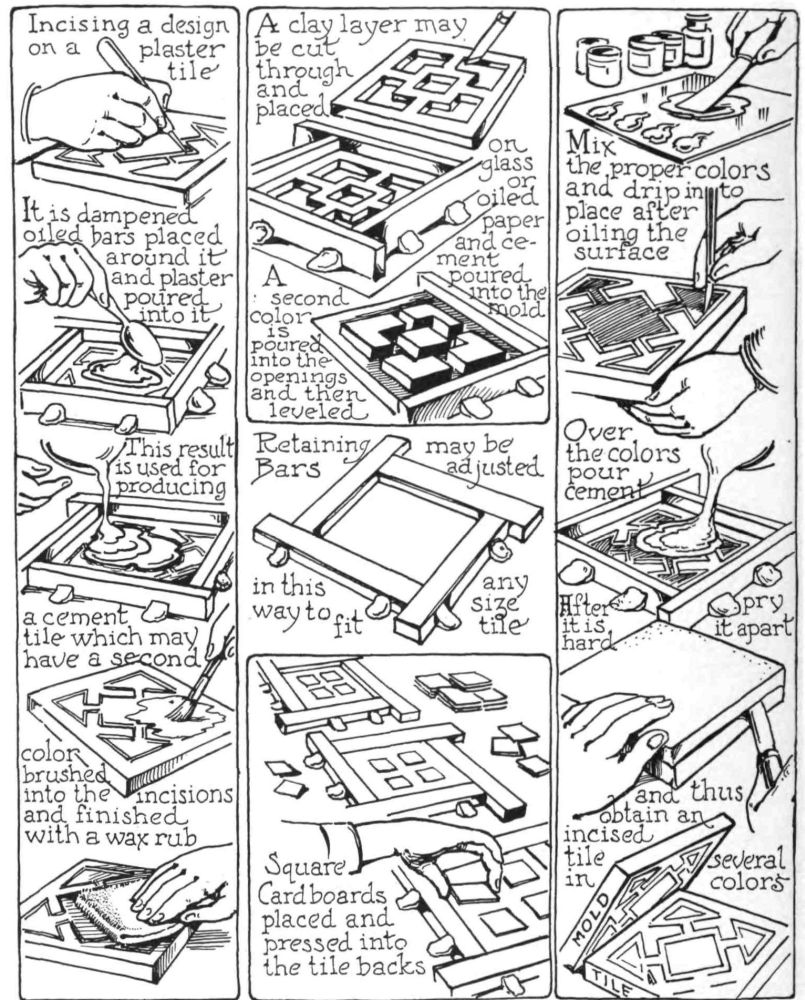 MOSAIC CEMENT TILES can be easily produced as follows: Secure a number of the small mosaic stone squares used by masons and tile setters for inlaying floors. These come in many colors and different geometric forms. Plan a four-inch tea tile arranging a design with the use of two or three different colors of mosaics. When the arrangement or design is decided upon, the mosaics should be glued face downward to a piece of cardboard or glass. If glass is used, it should be brushed with oil after the mosaics have been glued into position and before the cement is poured. Where glass is used the design arrangement on paper can be slipped underneath the glass to show the location and correct position for gluing the mosaics onto the glass surface. The mosaic pattern is then surrounded with retaining bars or slips of wood or surrounded with metal and the cement poured over the mosaics until the right thickness is secured. It is then left for several days to dry, after which it is removed from the glass or the cardboard is peeled away from the cement surface. The tile is then finished after being placed in water for a week to harden. Glue a piece of soft leather or felt on the bottom when the cement has thoroughly dried.