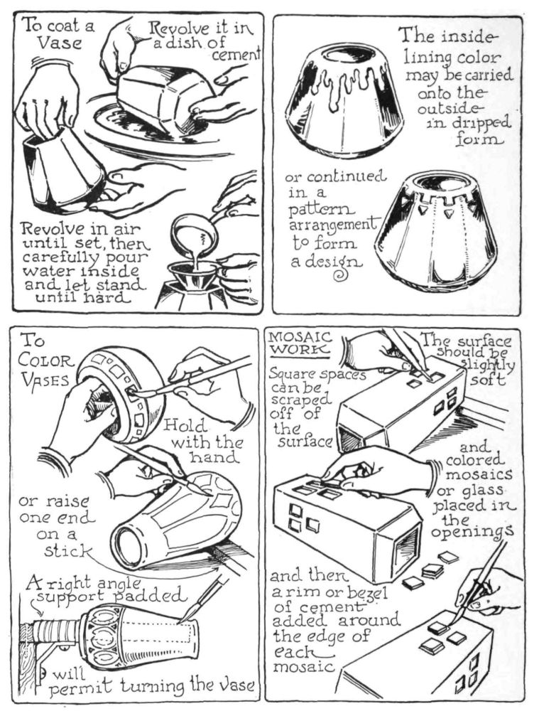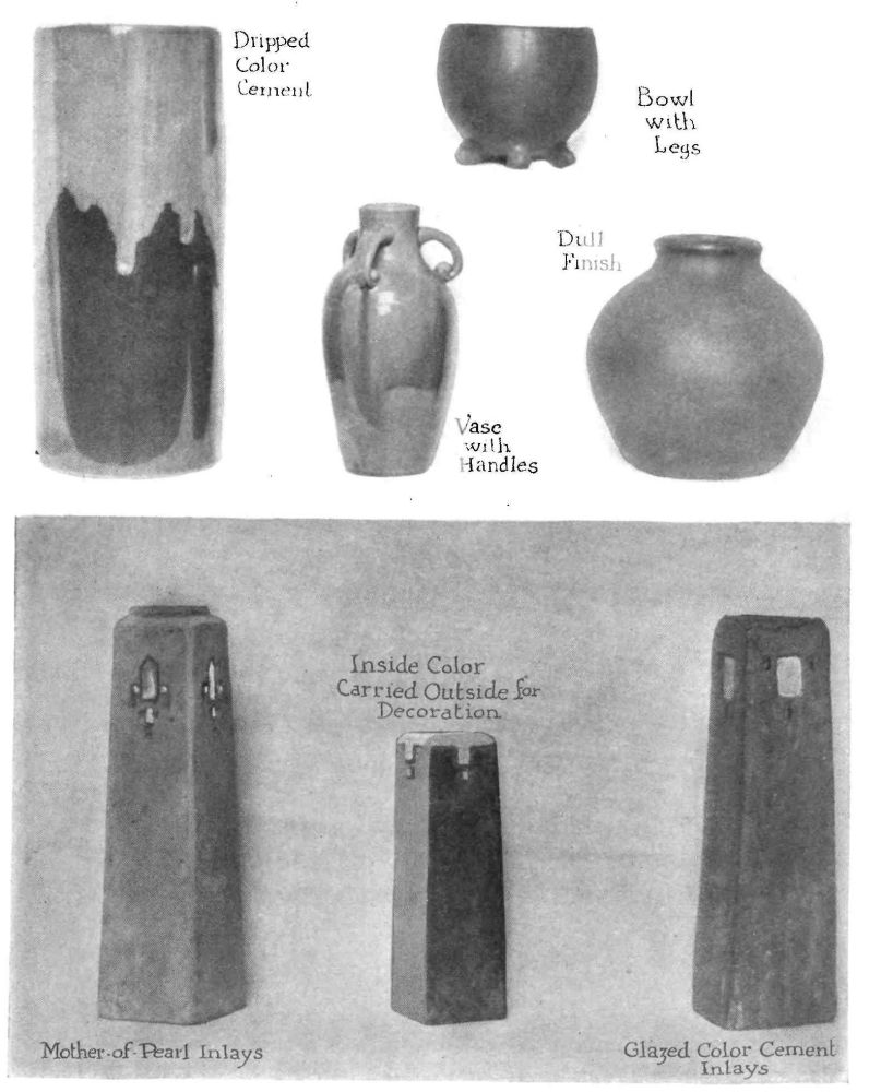 After a study some years ago of the various forms of producing clay pottery and its possible relation to school arts and industrial education, the handicap of necessary firing to give permanency loomed large against its general adaptation by schools. This resulted in considerable research and experimenting by the authors with cement and the use of color in the endeavor to parallel in some measure each of the methods employed in the making of fired tiles and pottery. Particular attention was given to simplifying the process of securing permanent form to many of the plastic forms of schoolroom art, which have been presented in clay and other perishable mediums. With the projects presented in the following chapters permanent useful objects can be secured by students in their school art subjects. Attention was also given to the enriching or refining{10} by decoration the many objects heretofore made in cement and concrete by vocational classes. The problems and methods explained in the following description solve this need.