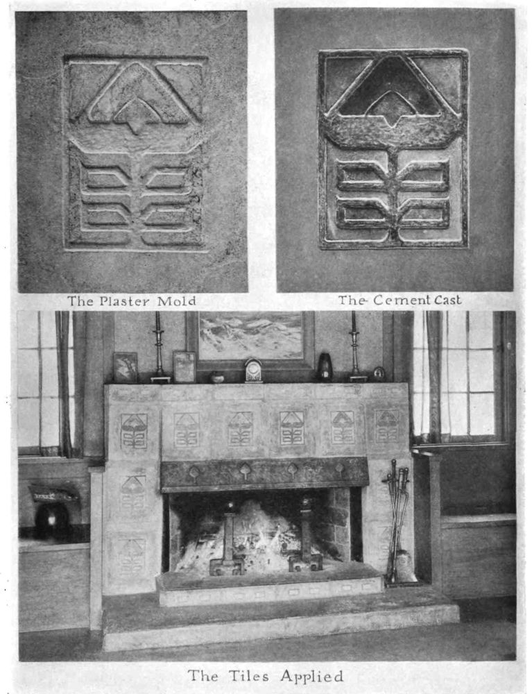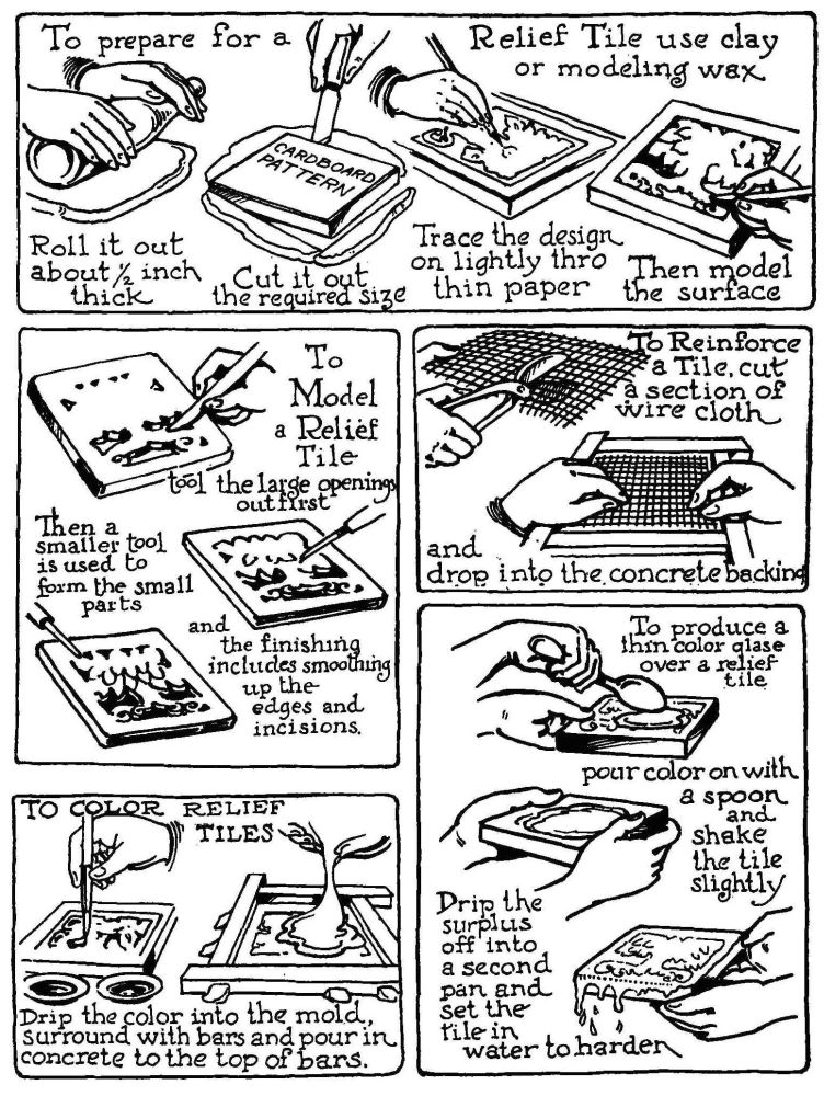 TILES WITH THE DESIGN IN A RELIEF LINE can be made as follows: The teacher should have previously made a number of plaster tiles with a smooth surface. These can be easily made by flowing the plaster onto glass or other hard, smooth surface, the plaster being retained between two strips of wood 4 × 4 inches. Cutting these bars of plaster into squares, one is given to each student. A simple design is made on paper first and traced onto the plaster tile. A nail or hard pencil is then used to incise the design in the plaster, after which it is brushed well with oil and surrounded with cardboard strips and cement poured into it. This will result in a tile with the design in relief. Within these relief lines cement with color added to it may be placed and the tiles placed in a tray of water with the water coming half-way up the side of the tile. The tile will be hard enough to remove in five days.