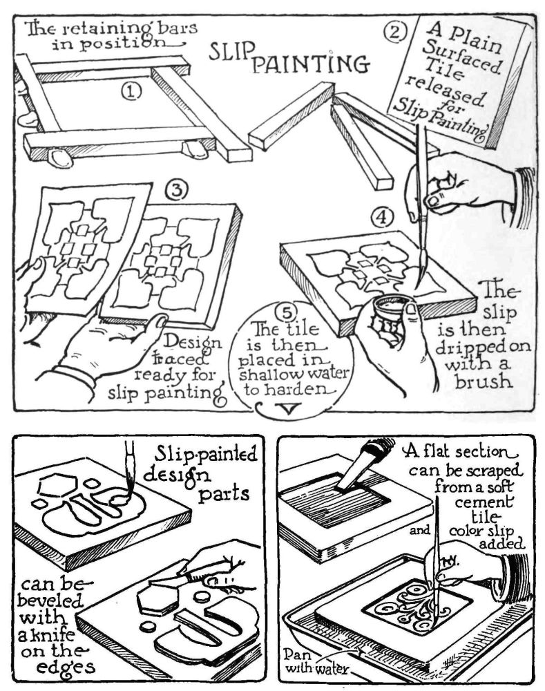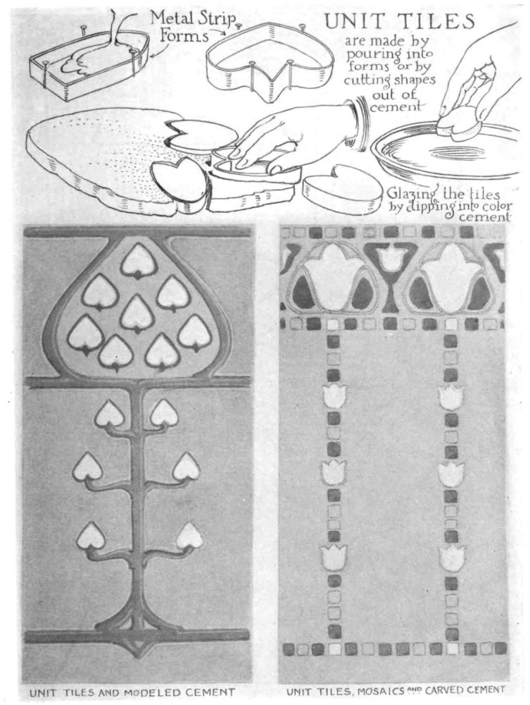 THE CEMENT SLAB IS MADE by surrounding an oiled surface (wood or glass) with wooden retaining walls similar to those used in making tiles. These walls should be oiled and otherwise made proof against leakage of water as it is necessary that all water in the cement be retained to perfect the hardening. The mixture of sand and cement (one part cement and two parts sand or gravel) is next poured into this space and permitted to set for several hours. Over this surface a thin layer of neat cement may be spread or dry neat cement sprinkled through a sieve and worked into the moist surface with the flat side of a palette or other knife.