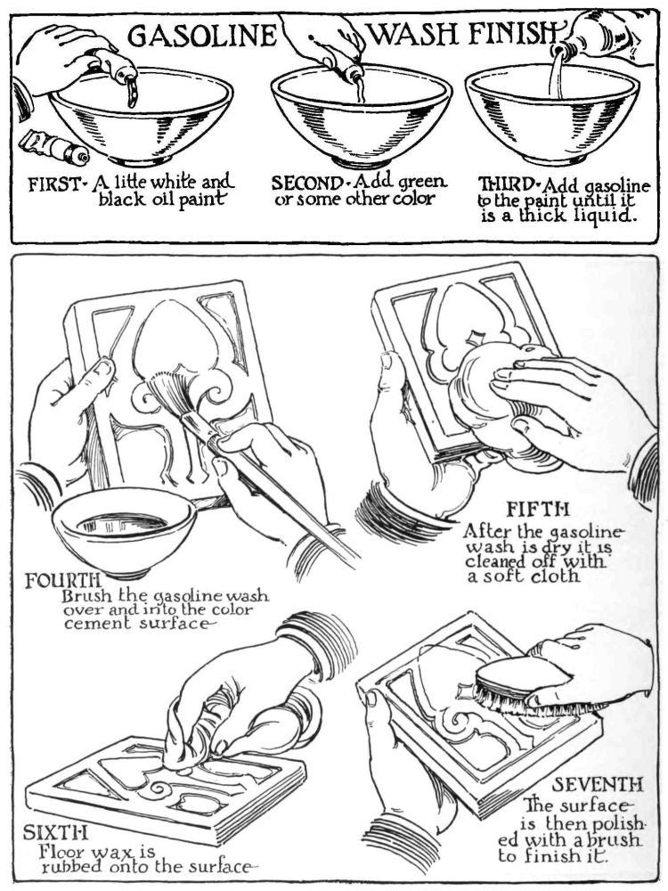 FOR VARIOUS COLORS in the same design, the dry mixture can be mixed with color and the liquid, or second mixture, added to it. This can be applied to the mold in the same way as the color was used with cement, and after it has set, can be backed with a general color of magnesite cement or with plain magnesite mixture.