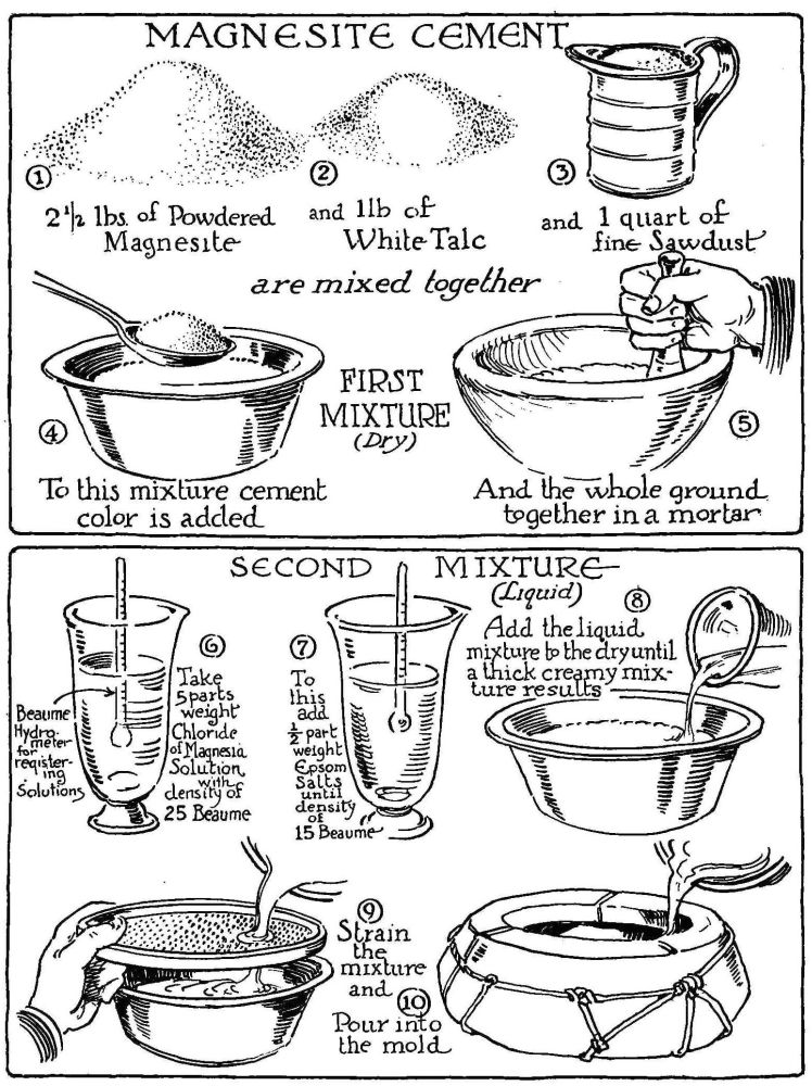 FIRST MIXTURE. Two and one-half pounds of powdered magnesite and one pound of white talc are mixed thoroughly with one quart of fine sawdust. To this mineral, dry color similar to that used and described for color cement should be added if a color tone is desired. About one-half as much color should be used as there is magnesite. In other words, one pound of color should be used with two and a half pounds of powdered magnesite. A stone mortar should be used to grind the entire mixture well together.