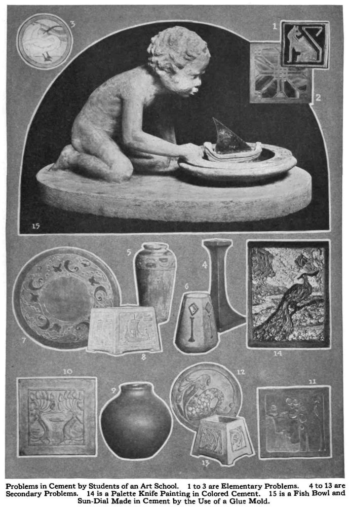 Problems in Cement by Students of an Art School. 1 to 3 are Elementary Problems. 4 to 13 are Secondary Problems. 14 is a Palette Knife Painting in Colored Cement. 15 is a Fish Bowl and Sun-Dial Made in Cement by the Use of a Glue Mold.