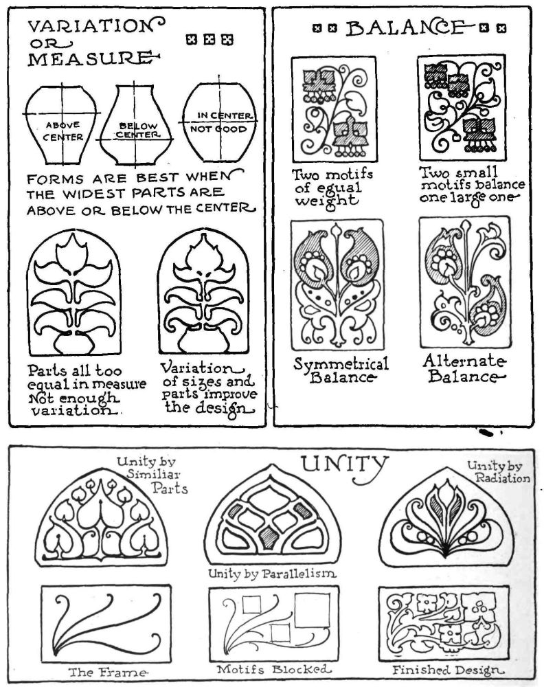 RADIATION, SYMMETRY, UNITY, SUBORDINATION, MEASURE, ETC., are all principles of importance, but the three that are of great value to the craftsman are Measure, Balance and Unity.