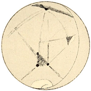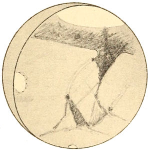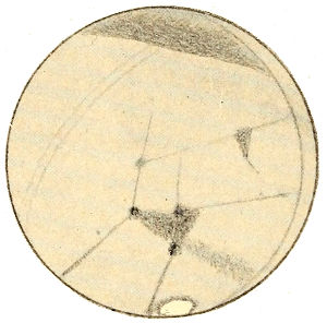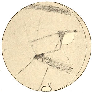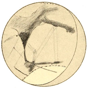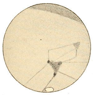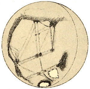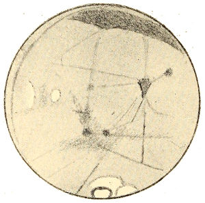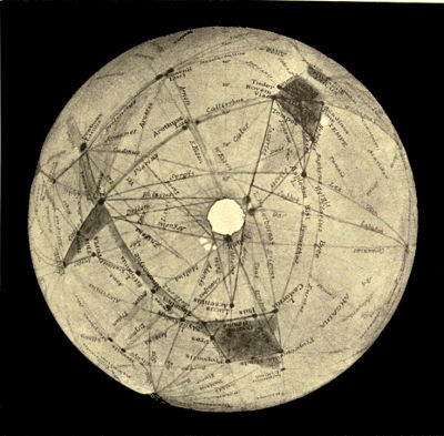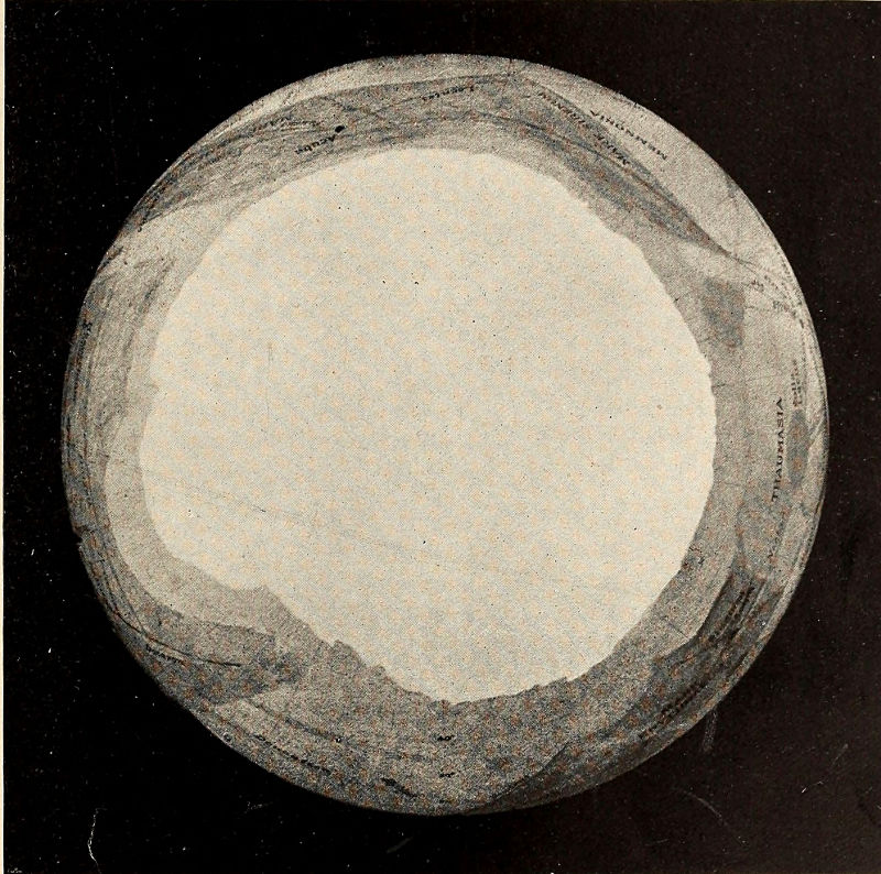 But as a planet ages, it loses its oceans as has before been explained, and gradually its whole water supply. Life upon its surface is confronted by a growing scarcity 367 of this essential to existence. For its fauna to survive it must utilize all it can get. To this end it would be obliged to put forth its chief endeavors, and the outcome of such work would result in a deformation of the disk indicative of its presence. Lines of communication for water purposes, between the polar caps, on the one hand, and the centres of population, on the other, would be the artificial markings we should expect to perceive.
