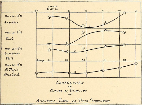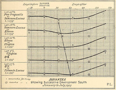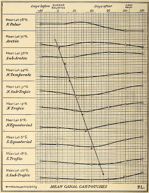 The alternate semi-annual quickening also discloses itself directly in the cartouches; the previous semestral growth from the south polar cap actually showing in them before the impulse from the north began. The 347 slow falling of their curves to the minimum preceding their later rise is nothing less than the dying out of the effect started six months before from the south. The gentler gradient of their fall proclaims a gradual lapse, just as the subsequent sharper rise points to the advent of a fresh impulse. And this deduction seems to be borne out by another circumstance. There is some evidence of decrease in the pre-minimal gradient southward. This is telling testimony to the source whence the impulse came. For if it originated at the south and traveled northward, the southern canals would be the first to be affected and the first to die out, and thus show a longer dead season, exhibited in the cartouches as a more level stretch.