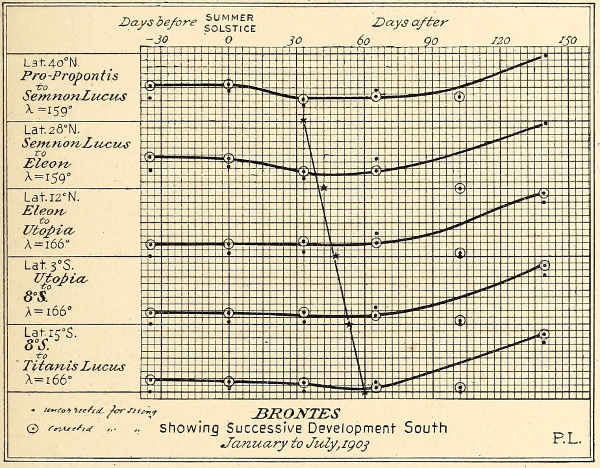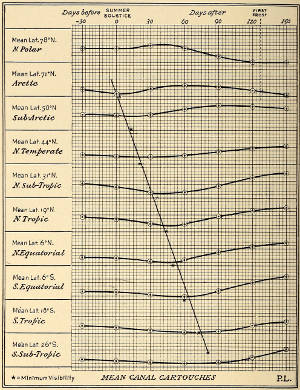 That we note such canals is therefore not only not subversive, but actually corroboratory, of the law it seems at first to shake. That all the canals of these zones do not show a like cartouche-profile is not necessary, a part of them being dependent, not upon the earlier, but upon the later liberated flow, and thus partaking in the general law, which grows uniform lower down the latitudes.