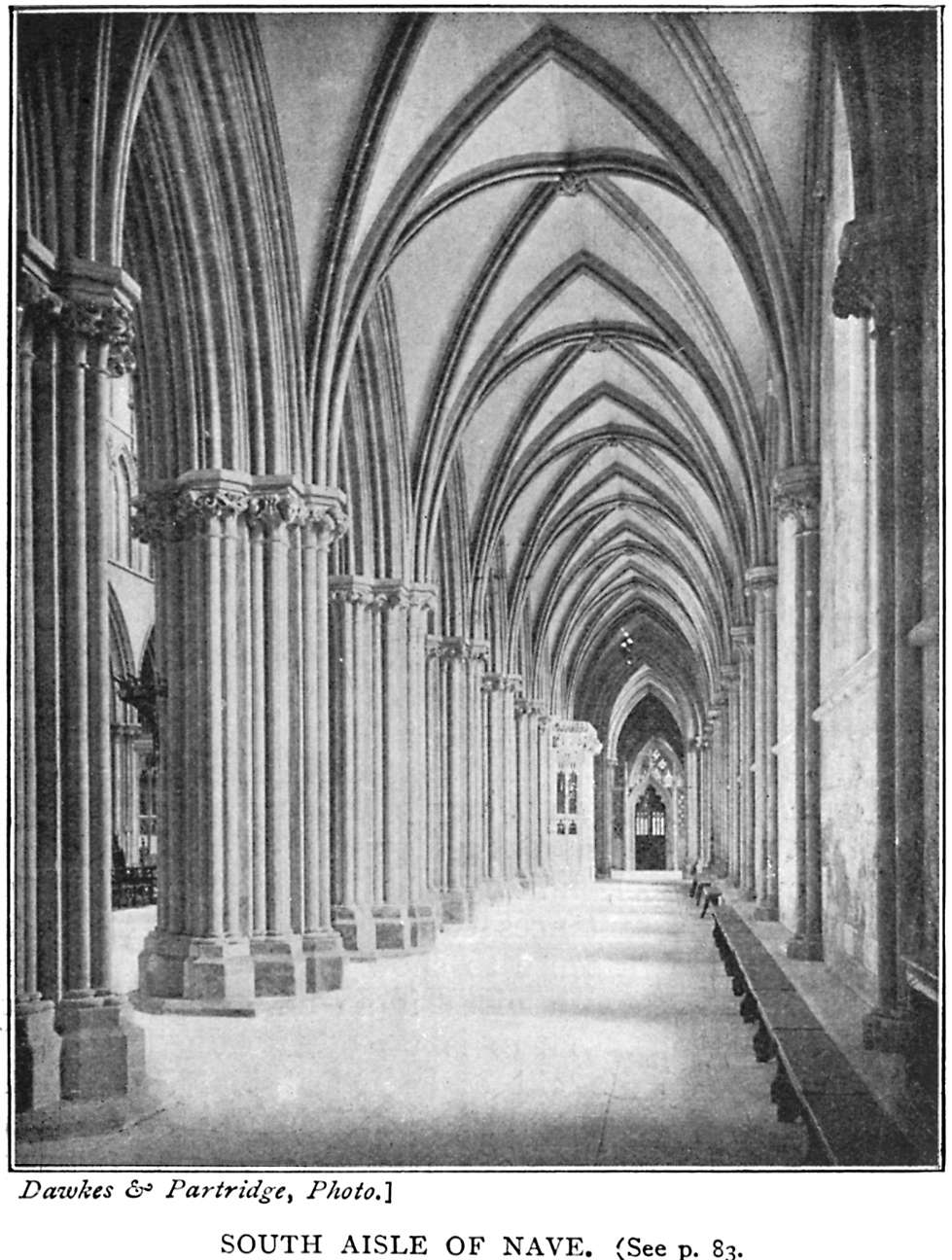 It is of great importance to remember this fact, since until recently the nave, with the other parts just mentioned, was attributed by Professor Willis, Professor Freeman, and most authorities to Jocelin. Willis, indeed, bowed to what was then thought to be documentary evidence against his own judgment; for he declared the work to be of a style much earlier than that of Jocelin's time (p. 73). Now we know almost to a certainty that the bulk of the cathedral belongs neither to the late Norman period of Robert, nor to the Early English of Jocelin, but to the period just between the two, that of Reginald de Bohun.