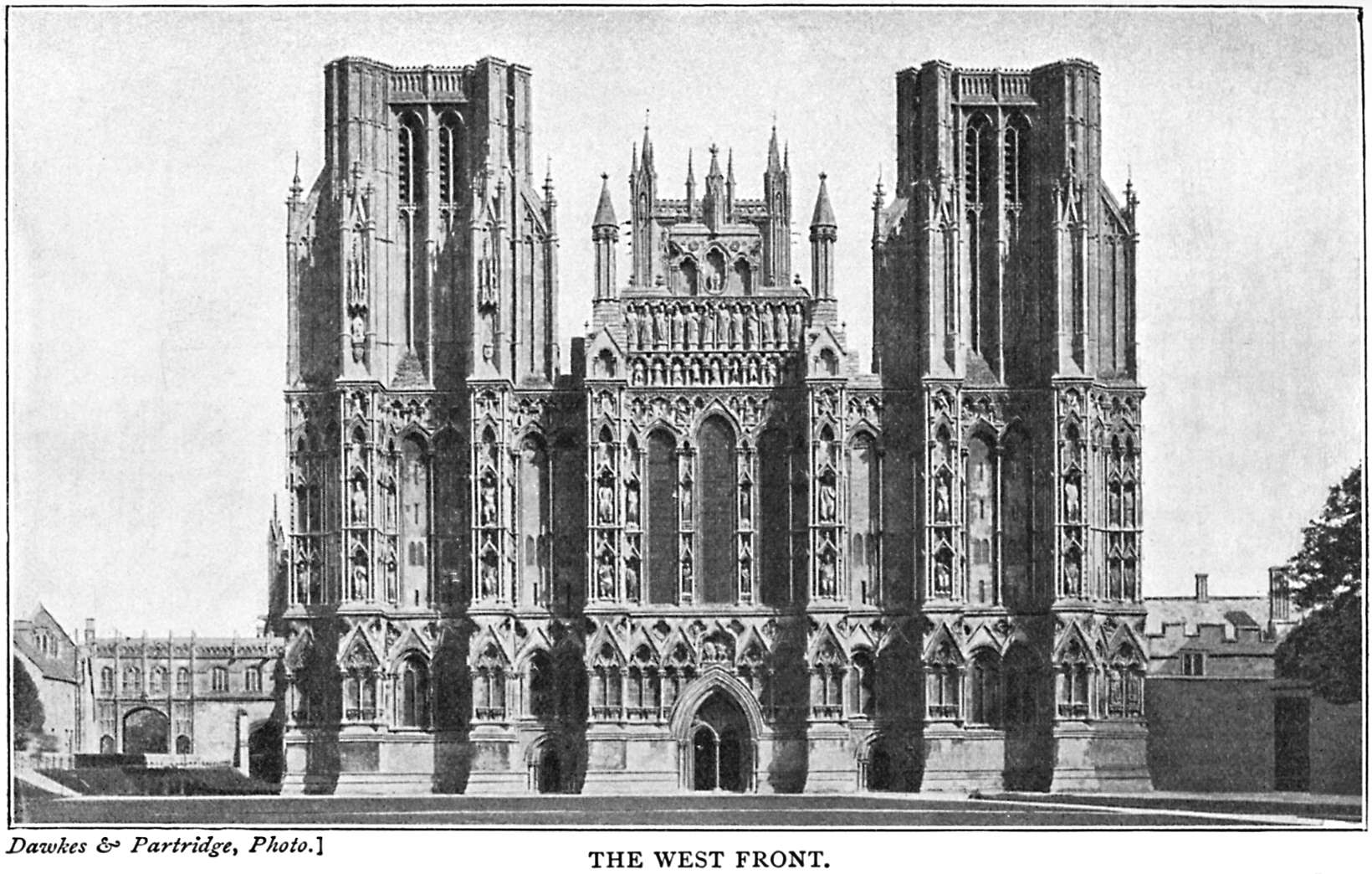 The West Front of Wells has been universally admired. Long ago, old Fuller wrote—"The west front of Wells is a masterpiece of art indeed, made of imagery in just proportion, so that we may call them vera et spirantia signa. England affordeth not the like." This verdict is but repeated by modern writers; the front is "quite unrivalled," says Fergusson, and comparable only to Rheims and Chartres. Mr Hughes, in Traill's Social England, goes farther and says2 that "nothing fit to rank with it was then being done in Northern Europe—for the monumental porches of France, 22formerly supposed to be contemporary, are now recognised as of a later date."