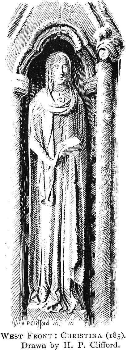 Before commencing a detailed description of the statuary, one must refer to Professor Cockerell, R.A., whose enthusiastic love of the work led him to construct a theory which he published in 1851, as an Iconography of the West Front. There can be little doubt that he was right in his general idea; there can be equally little doubt that he was wrong in nearly every application of it. Everyone now, for instance, takes it for granted that the south side of the front is mainly "spiritual," devoted to ecclesiastics, while the north is "temporal"; and that the whole of the fourth and fifth tiers do represent certain leading historical figures. But when we read Cockerell's reasons for identifying these figures we recoil in dismay. His knowledge of history is superficial, of costume he knows practically nothing; his drawings are as inaccurate as his imagination is fertile, and he states as obvious facts the wildest conjectures. Further reference will be found to his book in our description of the fourth and fifth tiers. It was at least an honest labour of love, and Cockerell deserves the honour, as he had to endure the disadvantages, of being the first in the field.