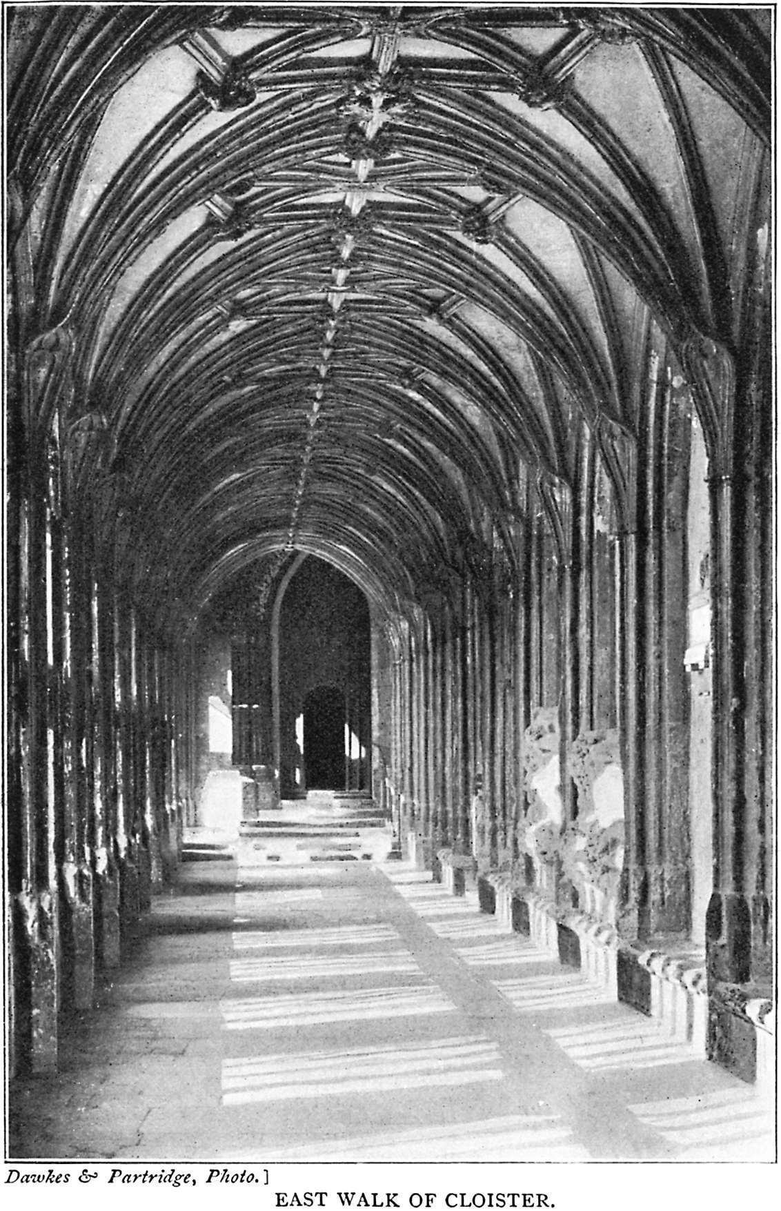 The Chapter-House Staircase is entered by the doorway in the eastern aisle of the north transept. There are few things in English architecture that can be compared with it for strange impressive beauty; the staircase goes upward for eighteen steps and then part of it sweeps off to the chapter-house on the right, while the other part goes on and up till it reaches the chain-bridge; thus the steps lie, worn here and there by the tread of many feet, like fallen leaves, the last of them lost in the brighter light of the bridge. Here one is still almost within the cathedral, and yet the carts are passing underneath, and their rattle mixes with the sound of the organ within.