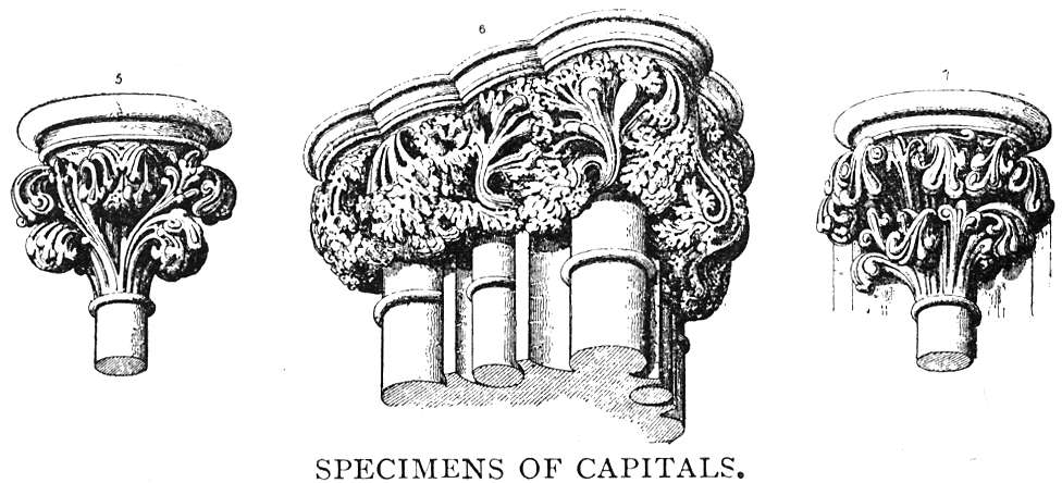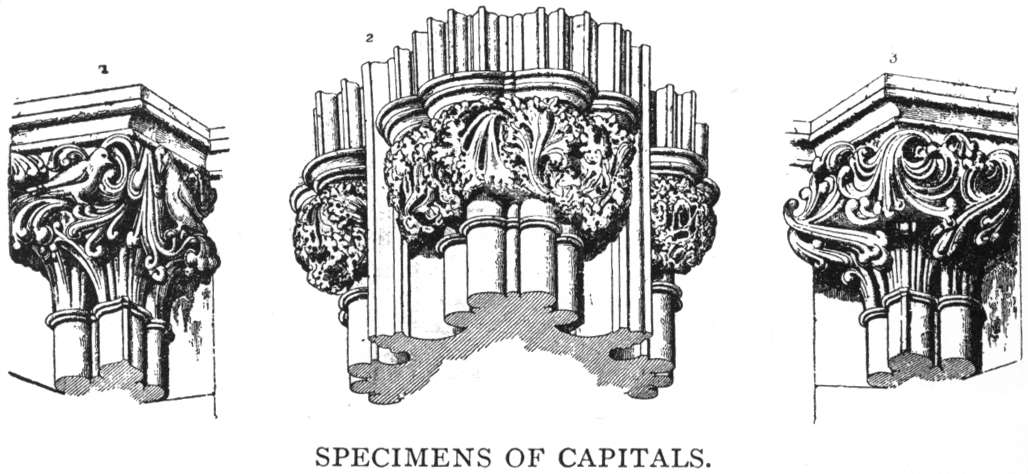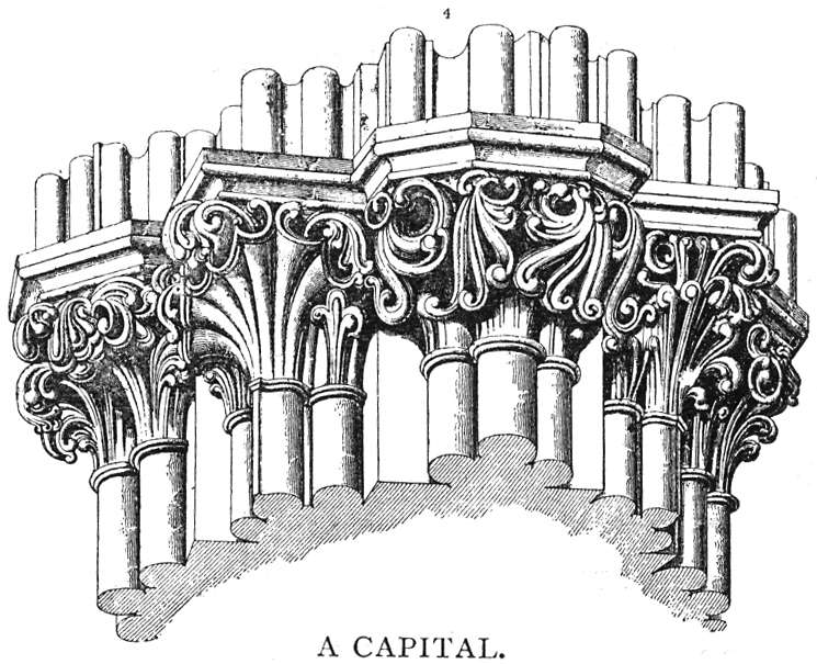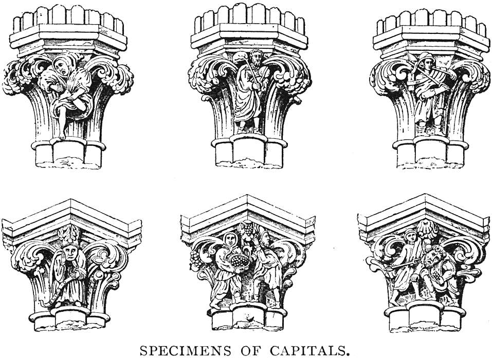 Professor Willis said that "the polygonal Lady Chapel and the vaulted work which connects it with the presbytery is a most original and unique piece of architecture, of pure and beautiful design." As to the first part of this sentence there can be no difference of opinion, and all will agree as to the fineness of the general effect of the chapel; yet there may well be two opinions as to the purity of the work. I confess that the following criticism (Builder, Aug. 1862) from a lecture of Mr E.W. Godwin seems to me to be not entirely without justification:—"With the single exception of the way in which the vaulting is managed, I look upon this Lady Chapel as no better than the other work of the same date. There is a weakness about the constant recurrence of the same form in the tracery of the windows; the lines of the vault are, in some cases, clumsy to a degree; and the capitals have lost their constructional character altogether. The growth and vitality, the change and joyfulness, so visible in the earlier caps, especially those with figures, are no longer to be seen. Leaves are now stuck on; or, at the best, wreathed round the bell of the capital; and so the function of the capital—the upbearing principle—is lost." So much for its defects. The peculiar excellence of the chapel is that it gives that apsidal ending to the church which adds so much to its beauty both within and without, and yet does not interfere with the square end of the presbytery.