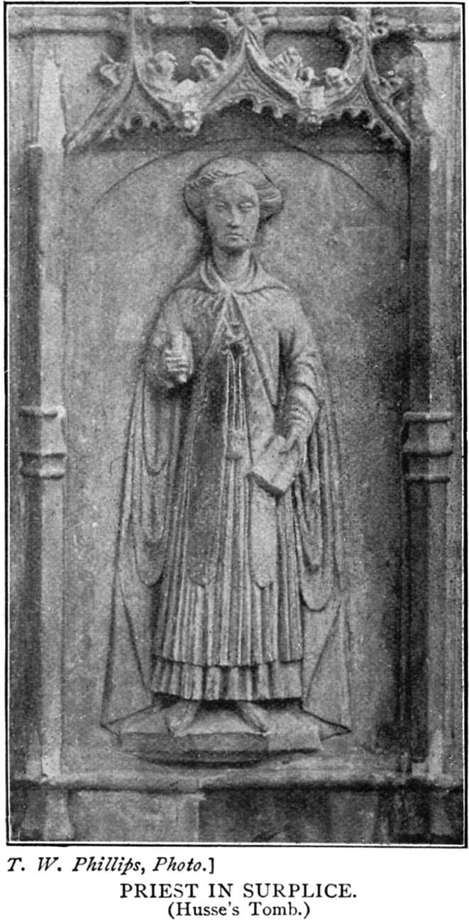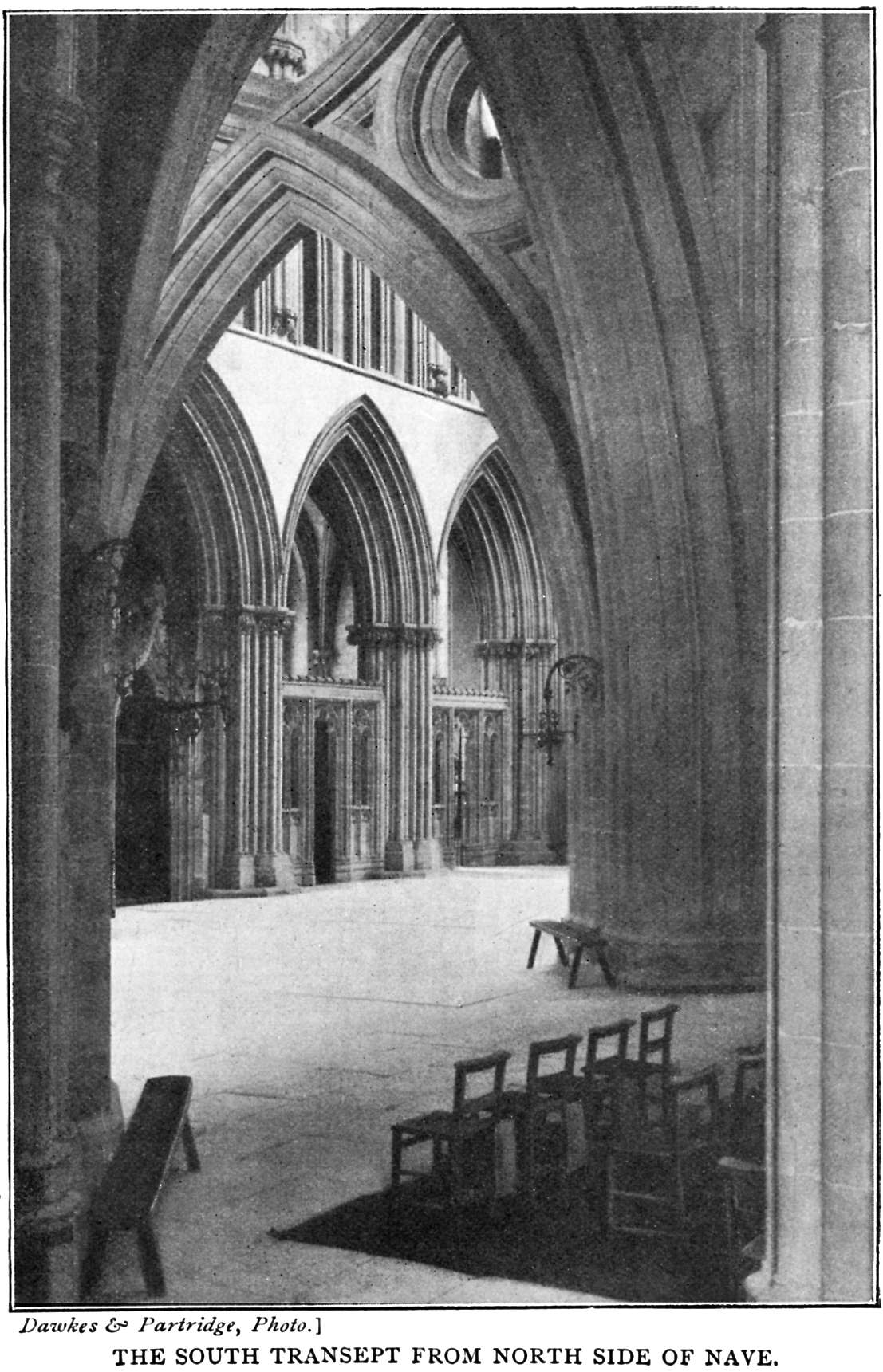 It is worth while to call to mind the kind of service for which the church was built, with its aisles and chapels and screen. The usual Sunday procession started from the north door of the presbytery, preceded by two thurifers with censers, went round behind the presbytery, the priest in his cope asperging the altars on his way, then down the south choir aisle, and through the south transept into the cloister. In the cloister-cemetery, the priest, with his ministers, said the prayers for the dead, and then rejoined the procession in the cloister Lady Chapel, where the first station was made. Thence the procession returned to the great rood in the nave, and there 10made the second station, the bidding-prayer being given out to the people from the rood-screen, after which it re-entered the choir. But on special occasions the ritual was increased; as, for instance, at the procession of palms on Palm Sunday, or the Corpus Christi Day procession, which is thus described by Mr J.D. Chambers3: "The procession, some time before the mass, should assemble in order at the step of the Choir (i.e. in the Presbytery), a priest in Albe and silk Cope carrying the Corpus Christi in a tabernacle or feretory under a canopy of silk raised over him and it on four staves, borne by four clerks in Albes and Tunicles, with lighted tapers. It should go out of the Choir down the Nave, and out at the West Door of the Church, round the Church and Cloisters as on Ascension Day"—i.e. round the outside of the whole church, beginning with the north side and returning round the east end, and through the cloister to the west door again, and thus back into the nave. The colours of the vestments at Wells followed in the main the custom of the neighbouring diocese of Sarum, but with some local variations, such as are set down in the Consuetudinary which Archbishop Laud had copied from the late thirteenth-century MS. Indigo and white were used on St. John's Day and on the Dedication Festival; in Advent, indigo; at Passiontide, red, and on Palm Sunday, "except one cope of black for the part of Caiaphas" at the singing of the Passion; red, too, on Maunday Thursday, but with a banner of white. Red was also used for Easter, Pentecost, and throughout the Sundays after Trinity; while for Virgin Martyrs, red was mixed with white. This mixture of colours was probably effected by the cantors wearing different coloured copes; thus for confessors saffron (croceus) was mixed with green, sicut honestius et magis proprie possunt adaptari festo; but St. Julian and some others had all saffron, while a few, like St. Benedict, had all indigo. White is comparatively little in evidence, but it was used at Christmas, and for commemorations of the Blessed Virgin. Black was used for the commemoration of the dead.