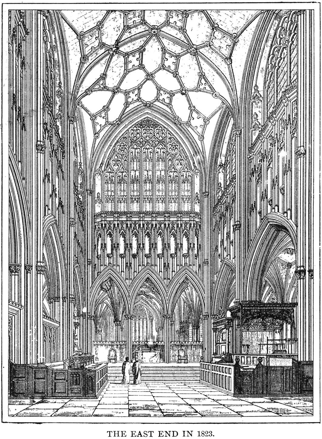 To this vision of stately pomp, and changing colour, we must add in our mind's eye the many chapels with their woven tapestries of flowers and beasts and birds, their rich ornaments and sacred associations; the majestic rood upon the screen, 11and the rich altars that stood before it; the almost constant succession of services that went on behind it, where the canons (each with his own book and candle) and their vicars sat, and the pyx hung over the high altar; the sound of a little bell from one of the chapels where mass was being said, the glimmer of a hanging lamp, the gleam of a silver image, the shrines here and there, with their frequent visitors; and, as years went on, the subdued light from the gorgeous painted windows (that over the high altar glowed then from east to west without obstructing organ), the frescoes on some of the walls, the green and red and gold of the later monuments; and over all the trail of incense and the sound of prayer.
