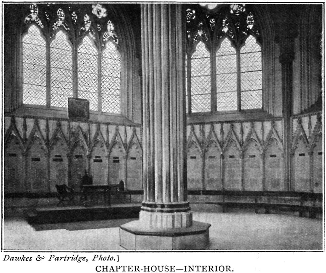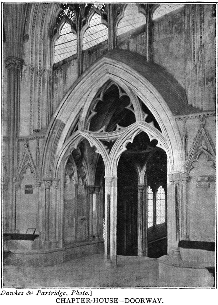 The Chapter-House is entered by a double-arched doorway, the small vault between the arches having an odd boss composed of four bearded heads. There are marks in the wall which lead one to think that the doors were hung in a wooden screen under this vault. The old doors are now used in the house of the Principal of the College, where they were identified by Canon Church. They have little slits in them, through which those in the chapter-house could speak with those without, who no doubt waited for admittance on the stepped stone bench of the staircase. Grooves in the two inner shafts of the doorway seem to have been made for the insertion of some light screen, by which the entrance was divided into two passages for ingress and egress. The absence of doors certainly adds to the rather cold unfurnished appearance of the chapter-house in its present condition.138