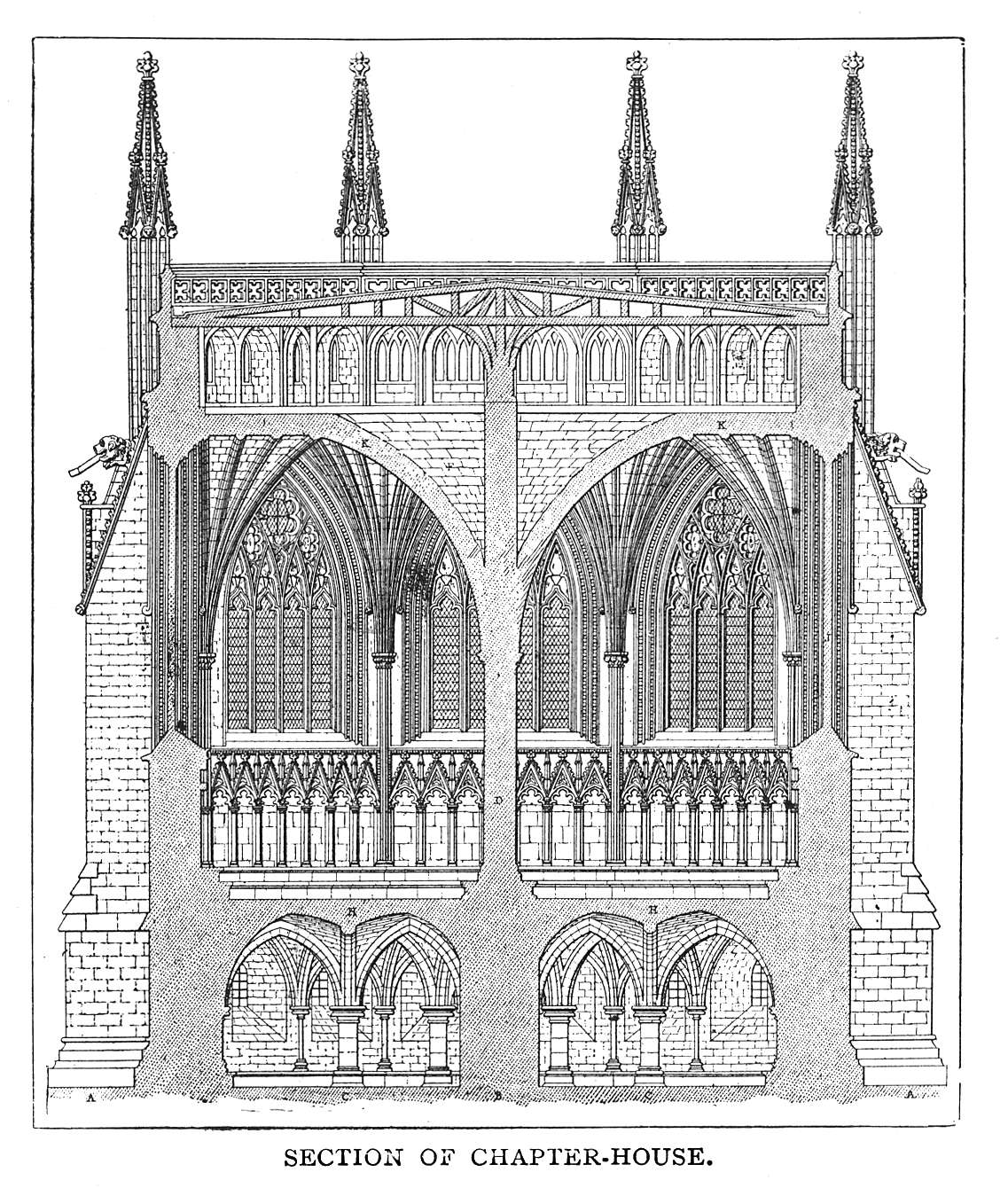 The works "now a long time begun" can hardly be anything else than the chapter-house undercroft, the outer walls of which may have been built some forty years before. Professor Willis, who had access to the document, decided, on architectural evidence, that the undercroft must have been already completed at this time, and his view may be safely accepted (Arch. Inst., "Bristol" vol., p. 28). The passage to the undercroft would seem to be the first result of the chapter's undertaking; its ornament is of a more advanced type than that of the undercroft itself, and one of its carved heads is swollen as by the toothache, and tied in a handkerchief. There can be little or no doubt that the "finishing" of the old works included also the building of the chapter-house staircase, and, when that was finished, the raising of the chapter-house itself (the nova structura of the old documents) upon the undercroft. The full Decorated style of the chapter-house is separated by a considerable interval from the late Early English of the undercroft, while that of the staircase, which is geometrical Decorated of a character not very far removed from Early English, must have been built before the chapter-house itself was begun.