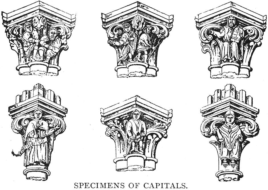 The long and heavy peace which followed was marked by the gradual pewing up of the choir and presbytery, and the intrusion of pretentious monuments. Then, in our own times, came the revival, bringing evil as well as good in its train. In 1842 the restoration of the nave, transepts, and Lady Chapel was commenced at the instance of Dean Goodenough, by Mr Benjamin Ferrey. He removed the thick layers of whitewash which had been ingeniously applied to conceal the sculpture; and the long rows of marble tablets which had disfigured the aisles were shifted to the cloisters, whence, it may be hoped, they will one day make a further journey towards oblivion.