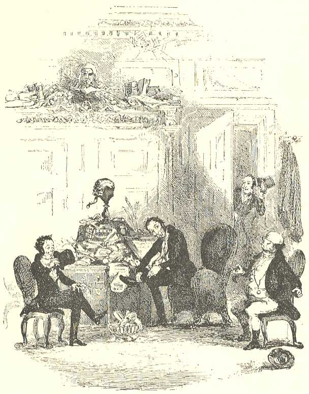 Mr. Perker had a dinner party that day, which was certified by the lights in the drawing-room windows, the sound of an improved grand piano, and an improveable cabinet voice issuing therefrom; p. 112and a rather overpowering smell of meat which prevaded the steps and entry. In fact, a couple of very good country agencies happening to come up to town at the same time, an agreeable little party had been got together to meet them, comprising Mr. Snicks the Life Office Secretary, Mr. Prosee the eminent counsel, three solicitors, one commissioner of bankrupts, a special pleader from the Temple, a small-eyed peremptory young gentleman, his pupil, who had written a lively book about the law of demises, with a vast quantity of marginal notes and references; and several other eminent and distinguished personages. From this society little Mr. Perker detached himself on his clerk being announced in a whisper; and repairing to the dining-room, there found Mr. Lowten and Job Trotter looking very dim and shadowy by the light of a kitchen candle, which the gentleman who condescended to appear in plush shorts and cottons for a quarterly stipend, had, with a becoming contempt for the clerk and all things appertaining to ‘the office,’ placed upon the table.