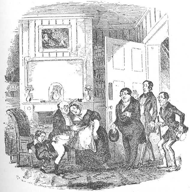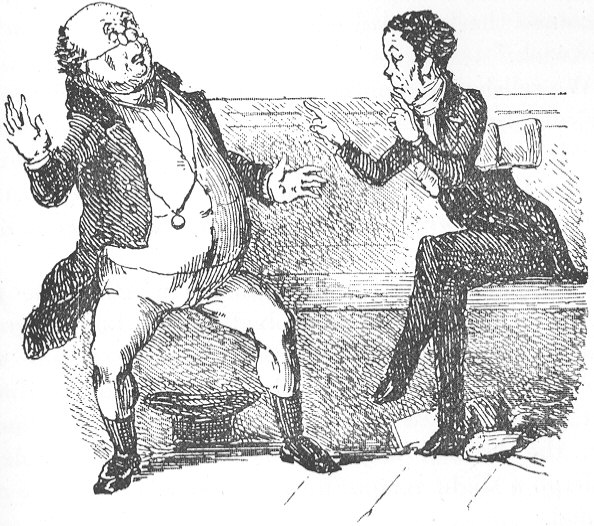 All went well until the unluckly morning in July, 1827, when Mr. Pickwick’s friends, coming to pay a morning call, and entering unexpectedly, surprised Mr. Pickwick with his landlady fainting in his arms in an hysterical condition. This was a very awkward business. The delinquent, however, did not at once grasp the situation, and could not “make head or tail of it, or what the lady meant.” His friends, however, had their doubts: