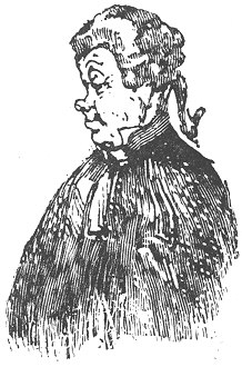 And what was Mrs. Bardell like? One would imagine her a plump, buxom widow, “fat, fair, and forty,” with her dear little boy, “the only pledge of her deceased exciseman,” or say something between thirty and forty years old. Fortunately, two portraits have come down to us of the lady—one somewhat of this pattern, and depicting her, as she flung herself on Mr. Pickwick on that disastrous morning: the other—a swollen, dreadful thing, which must be a caricature of the literal presentment. Here we see a woman of gross, enormous proportions seated on the front bench and apparently weighing some thirteen or fourteen stone, with a vast coarse face. This is surely an unfair presentment of the worthy landlady; besides, Dodson and Fogg were too astute practitioners to imperil their chances by exhibiting to his Lordship and the Jury so ill-favoured a plaintiff. Indeed, we are told that they arranged a rather theatrical exhibition in this scene, with a view of creating an impression in their favour.