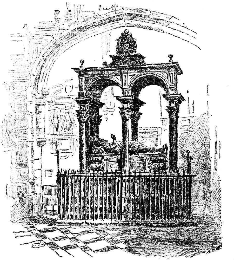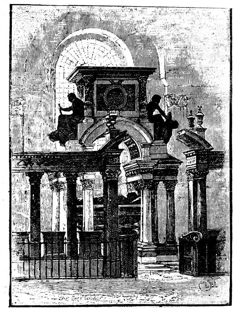 In the shadow of Westminster Abbey stands a homely-looking edifice of Churchwarden’s Gothic. Uninviting as is the exterior of St. Margaret’s, its interior is most interesting and suggestive. Restored not many years ago with excellent taste and reserve, it has been gradually beautified under the direction and encouragement of the rector, Archdeacon Farrar; so that, small and unpretending as it seems, a couple of hours may be profitably spent in viewing it. The interior is of the collegiate pattern, with a flat panelled roof supported by airy and elegant columns with delicate mouldings. The walls have been judiciously allowed to display the outlines of their stones, which furnish good detail and background. No church of its size, perhaps, is so rich in tombs and tablets, all of which are more or less interesting; and they are disposed so as to heighten the general effect. Some are fitted on to the light columns, shield-like, and bent to the mouldings. Most of the memorials are of one formal kind; a bust or medallion in the middle, a pediment above, and below a black marble slab or tablet with the inscription. The marbles are mostly of rich russet tones, or of a plum tint.
