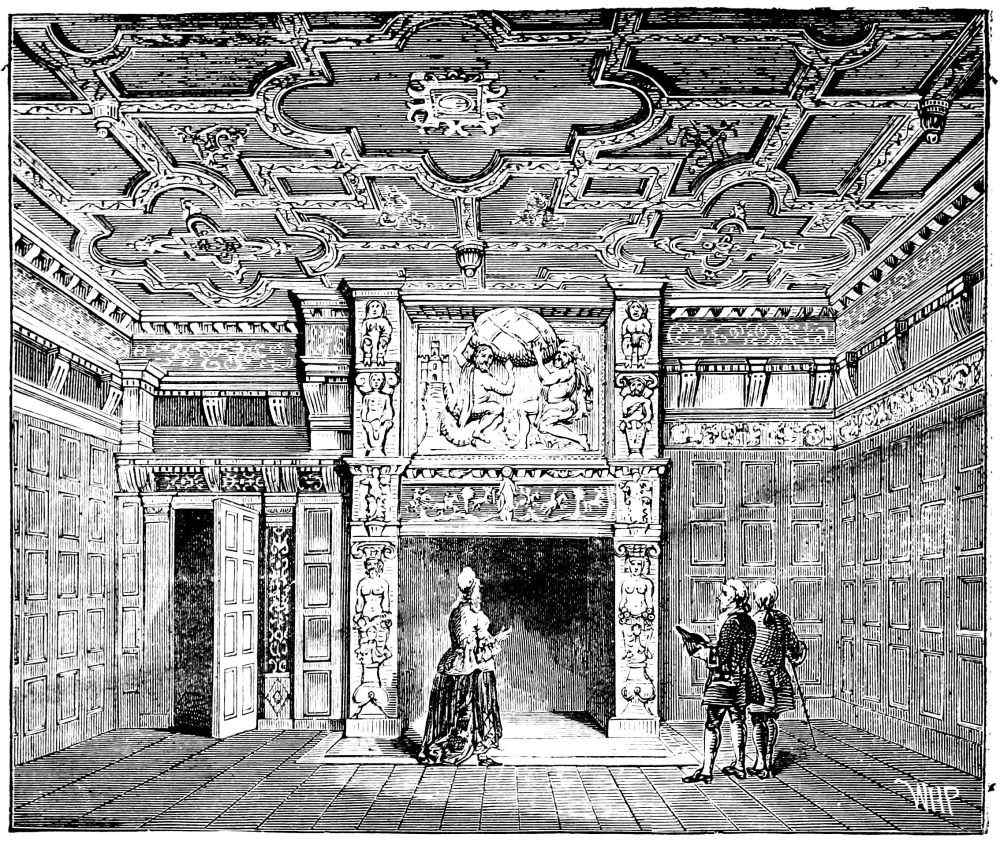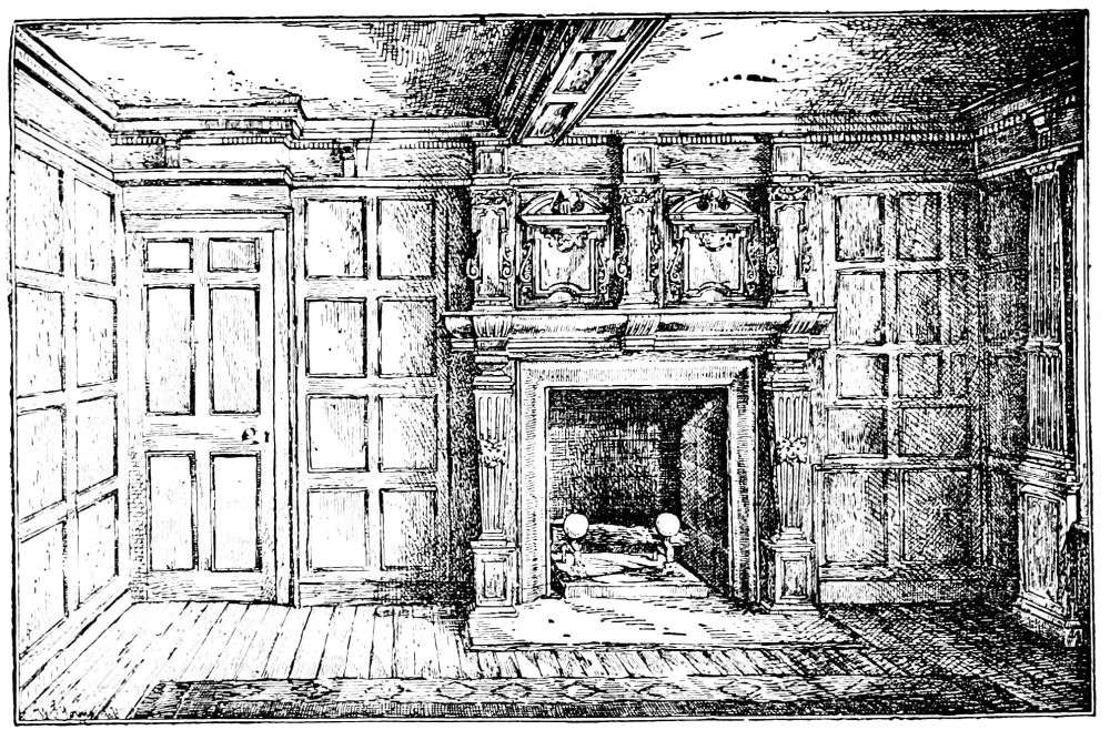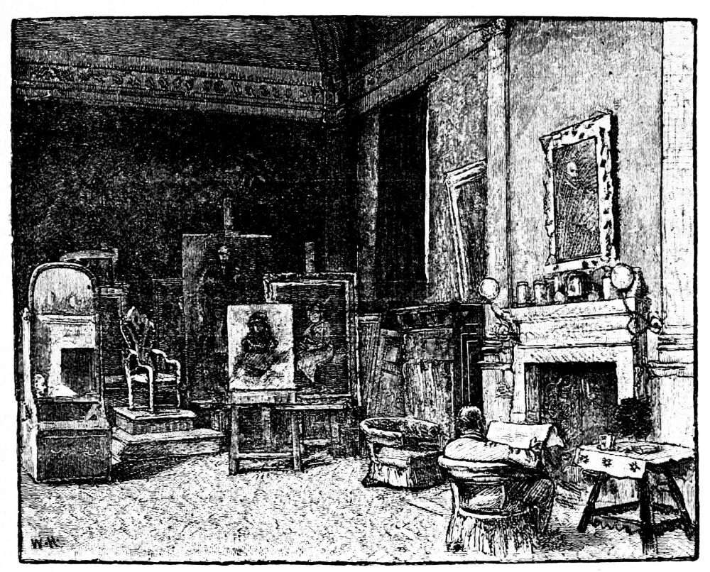[30] Many years ago the town was excited by the description of a room which that clever, erratic artist, Mr. Whistler, had designed and painted for a gentleman of fortune, Mr. Neyland. It was known as “the Peacock Room,” and is all painted in blues and gold, after the pattern of tints in the peacock’s tail. The dado is blue on a gold ground, and above it the scheme is reversed, being gold on a blue ground. This rich and gorgeous arrangement is now, probably enough, somewhat faded.